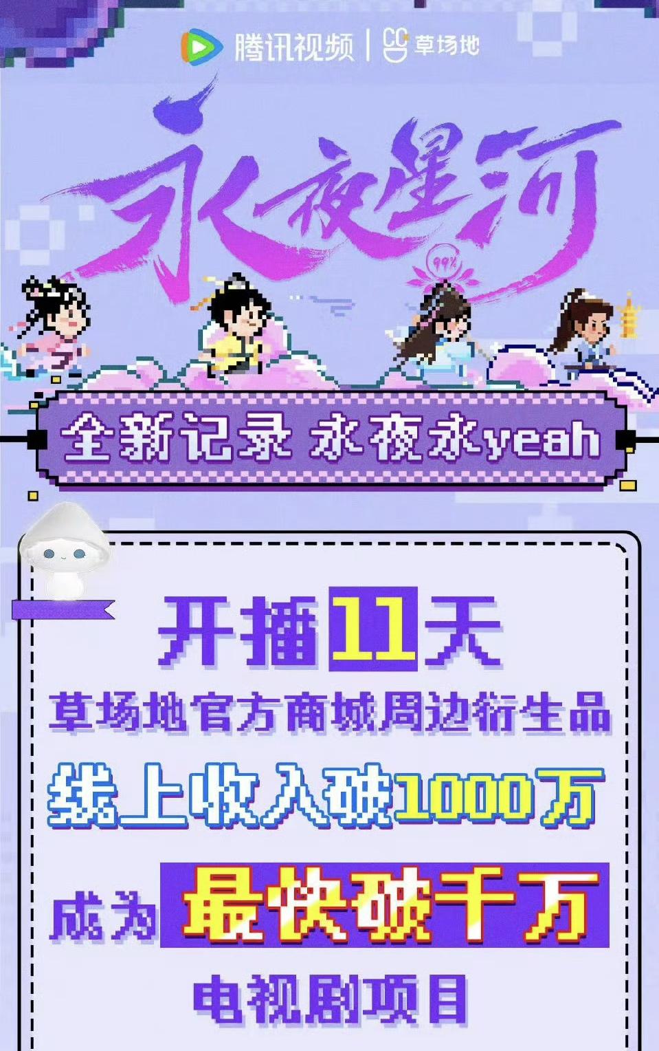 举个最近的例子,《永夜星河》播出后,衍生品在腾讯视频草场地官方商城,仅十多天就突破千万元销售额。在「新声Pro」主办的第一届新声年会上,恒星引力创始人王一栩透露,剧集上线前三个月,他们就和平台一起投入了衍生品开发,「(腾讯)视频的小伙伴非常专业,对每一个产品链条以及制作中可能存在的小瑕疵,都进行了很长时间的监修。」