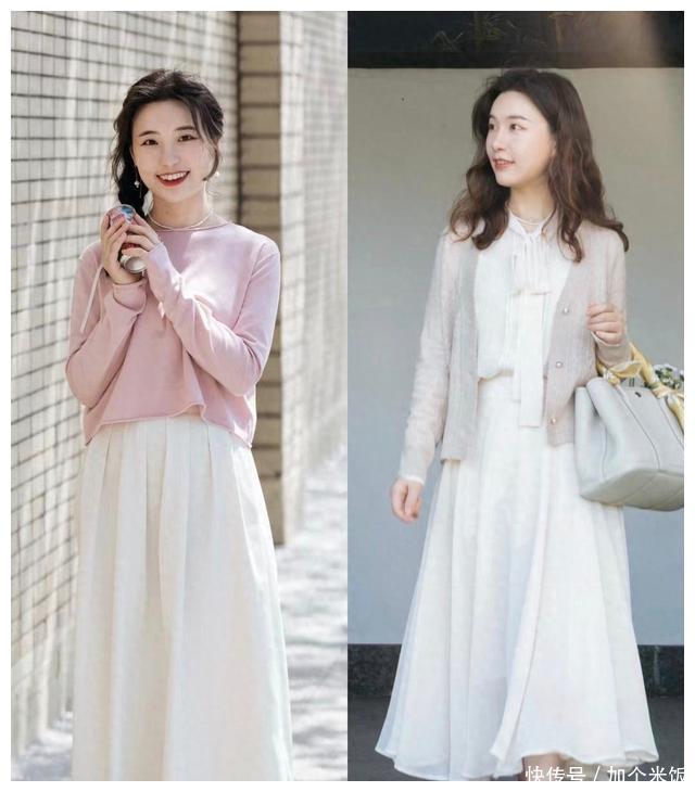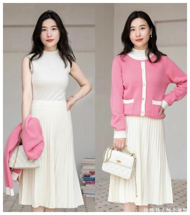 像这件粉色的针织开衫这种色彩和裙装的结合方便女性的气质变得更加的柔和唯美白色裙装的组合又会让整个的配色简洁明了。