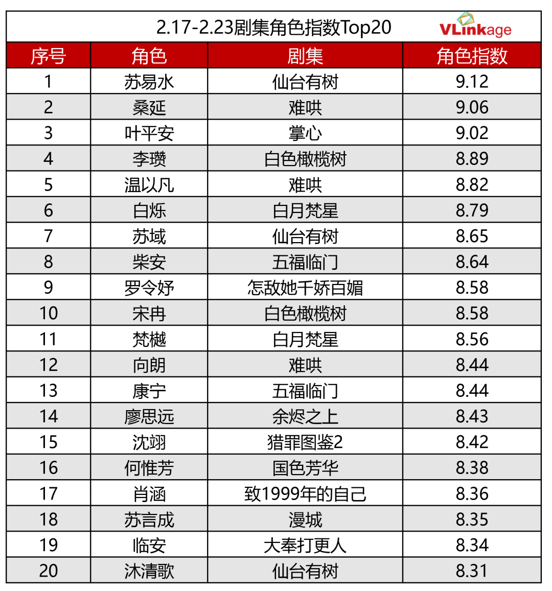 下图为上周剧集角色指数Top20,来自热播偶像剧《仙台有树》和《难哄》的男主苏易水和桑延,在剧迷中有着高关注度。人气同样很高的还有《掌心》女主叶平安。