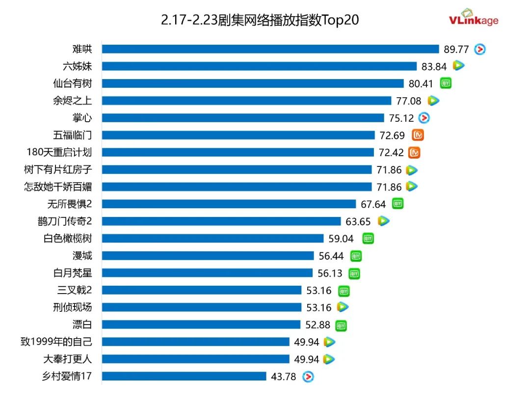 下图为上周剧集网播指数Top20,热度最高的作品为上周新剧《难哄》。该剧首周网播指数便高达89.77,随着后续剧情展开,有望成为今年首部热度破90的现偶剧。年代剧《六姊妹》和古偶剧《仙台有树》上周热度也表现不错,网播指数均在80+。