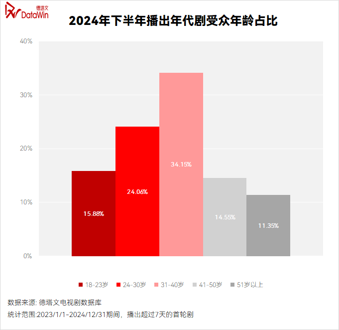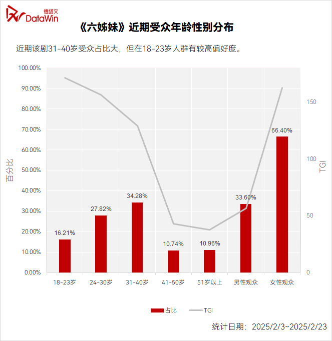 这里必须要提到的是,拿《六姊妹》18-23岁、24-30岁的受众占比与2024年下半年年代剧的18-23岁、24-30岁受众占比作比较可知,凭借在历史跨度中演绎跌宕起伏的故事,展现人物曲折的命运史、心灵史的内容优势,《六姊妹》在实现了类型剧受众巩固的基础上,有效拓宽了作品受众圈层,最终赢得了全域全年龄段观众的青睐。