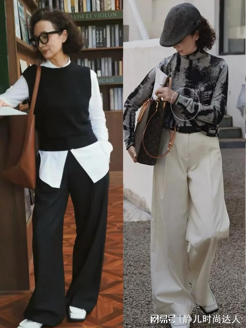 还有一个细节就是颜色的选择,一般中年女人的穿搭都是以基础色彩为主,所以选择阔腿裤时也不建议大家去挑战那些鲜艳的色彩,大红大紫的阔腿裤本身就很难搭配,像这种黑白色的阔腿裤,会更适合日常。