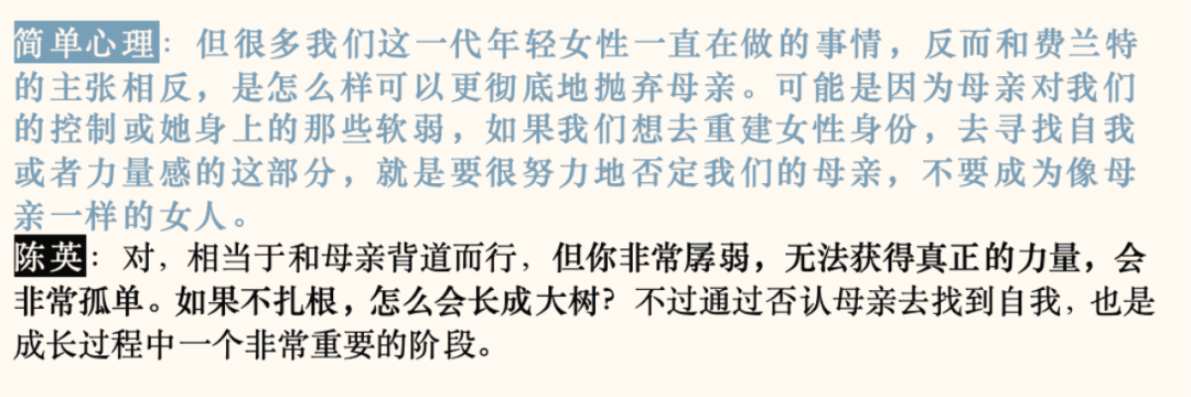 埃莱娜·费兰特说,“对于女性来说,每一种爱的关系,无论是婚内的还是婚外的,都不仅仅基于一种原始的关系,也是重新经历和母亲的关系”。其著作译者陈英也在采访中说“女儿就是要从母亲身上获取所有的东西,包括她的缺点,要找到那个力量的源泉。”