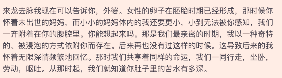 如此这般相互映照、互为养料的几代女性之间,曾经有脐带相连,现在有纸笔作为纽带。母亲作为女儿的过去和未来同时存在,女性书写母亲,也是在书写自己。