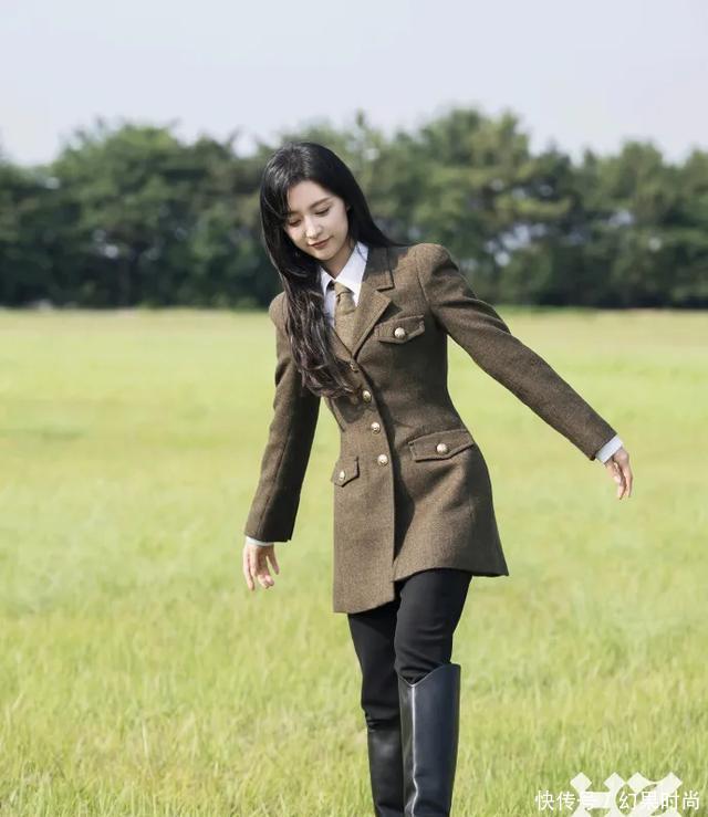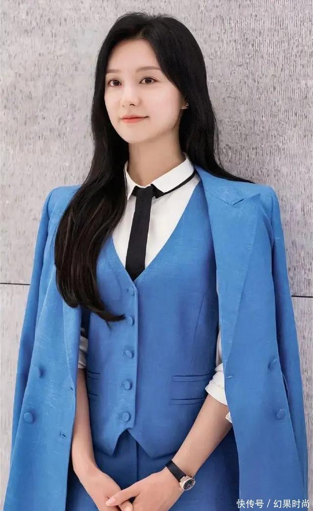 一套深蓝色的西装套装,是她在剧中多次出现的经典造型之一。这套西装剪裁得体,线条流畅,既凸显了她的身材优势,又彰显了她干练利落的气质。搭配一双同色系的高跟鞋,更是让她的整体造型显得高挑而优雅。