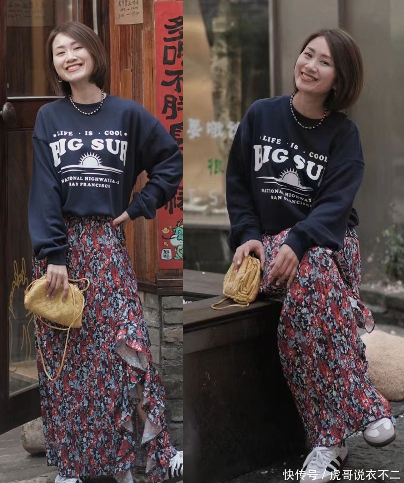这时很多大龄女士就会直接联想到一种搭配方案,那就是将碎花长裙与纯色服装结合到一起,一繁一简的对比,自然轻松就形成了平衡效果。