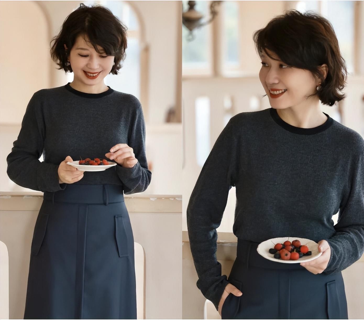 比如这条深色的过膝半身裙,就能让女性呈现出一些沉稳的气息,在上半身也可以搭配同色的服装,而保持着颜色结合的极简感。