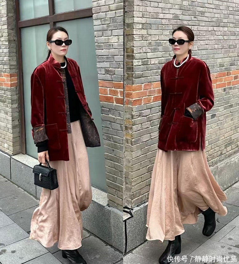 对于上装的搭配,主要是运用了一件新中式的粉色褂子,但看起来丝毫没有刻意装嫩的感觉,反而显得外形端庄有韵味。
