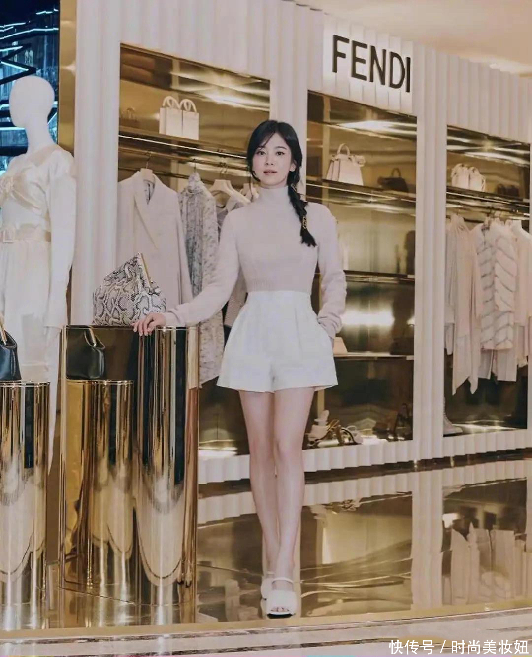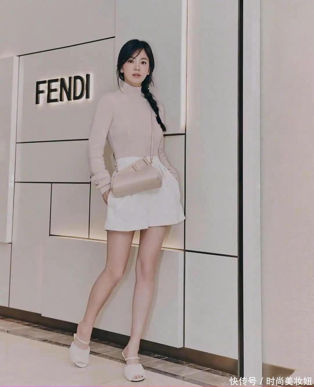 针织衫是很日常的单品,单穿或作为内搭都是很不错的。想要更显腰线的话,就要选择短装的款式,比如宋慧乔身穿针织衫,刚刚好修饰腰线,显瘦又显高挑。三七分比例的搭配把身材优化到了极致。