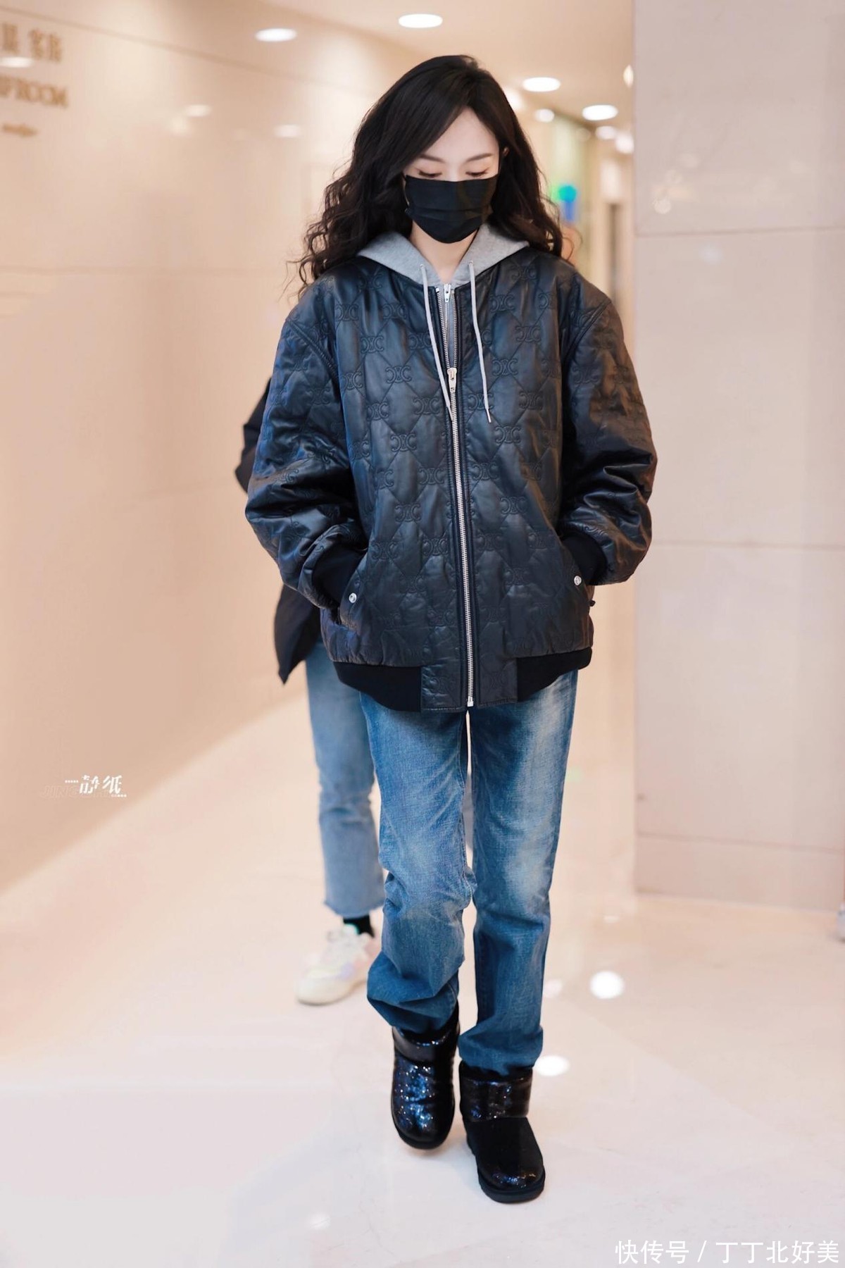 见多了“牛仔裤+运动鞋”造型,使得很多人潜意识里觉得牛仔裤就得搭配运动鞋,其实不是的,就像唐嫣此身造型。牛仔裤的裤脚堆砌在雪地靴的靴筒之处,潮味十足不说,还将整体造型的层次感拉满。