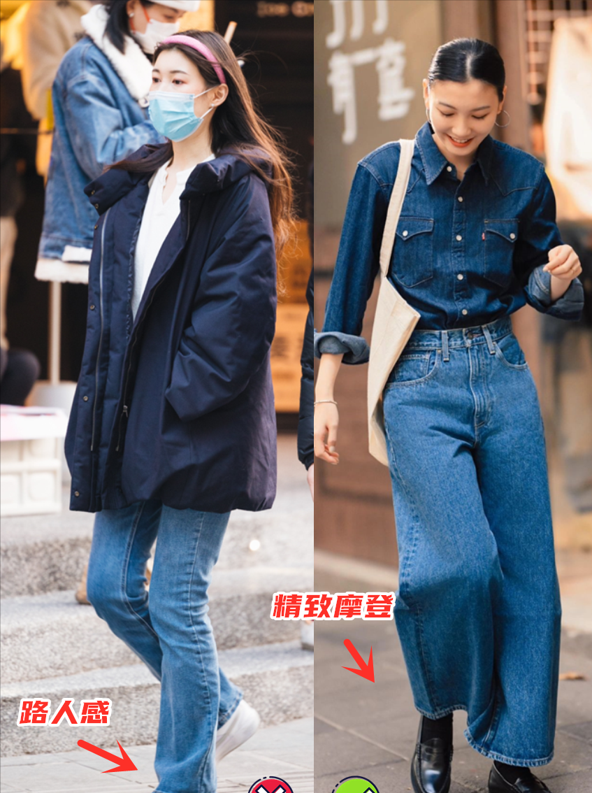 牛仔裤的选择:在选择牛仔裤时,要注意裤子的版型和颜色。版型方面,建议选择紧身或修身的款式,这样能够更好地突出腿部曲线。颜色方面,建议选择深色系的牛仔裤,如黑色、深蓝色等,这样能够让腿部看起来更加修长。