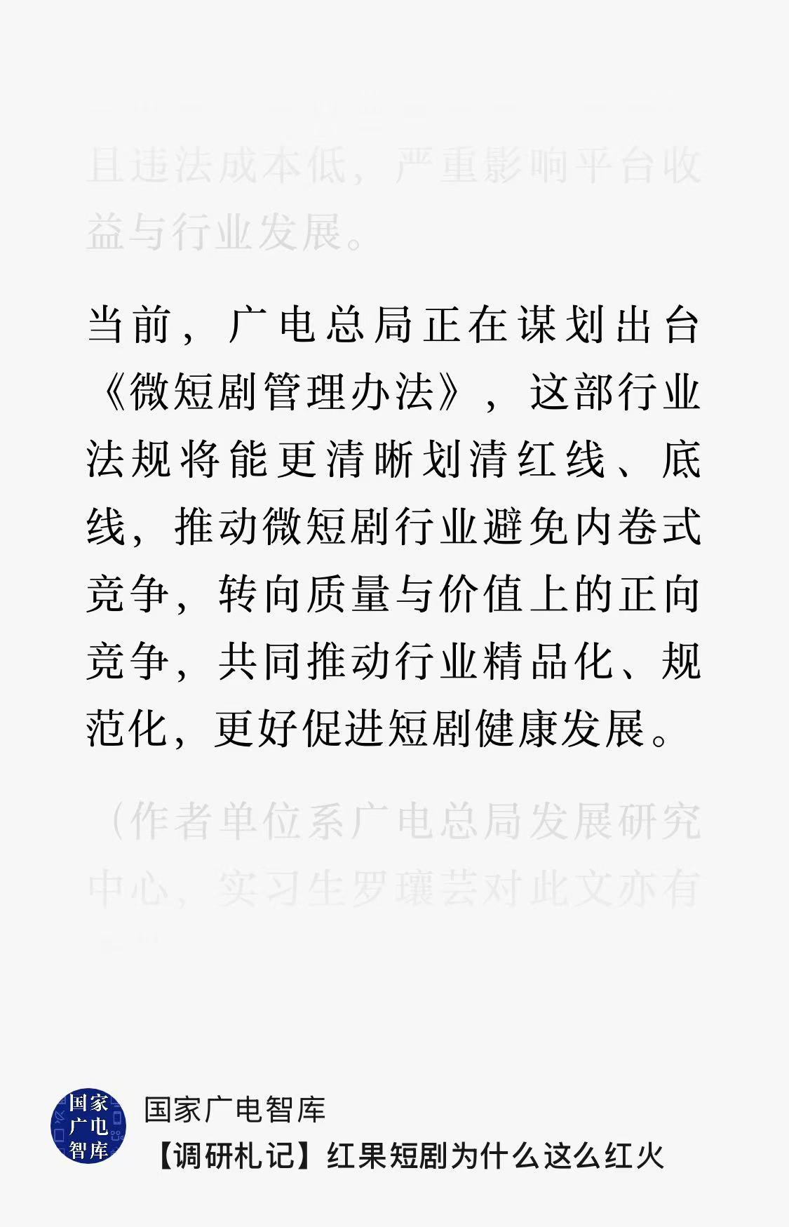 国家广播电视总局发展研究中心主办的“国家广电智库”公众号近日的一篇署名文章中提到,总局正在谋划出台《微短剧管理办法》,并表示,“这部行业法规将能更清晰划清红线、底线,推动微短剧行业避免内卷式竞争,转向质量与价值上的正向竞争,共同推动行业精品化、规范化,更好促进短剧健康发展。”
