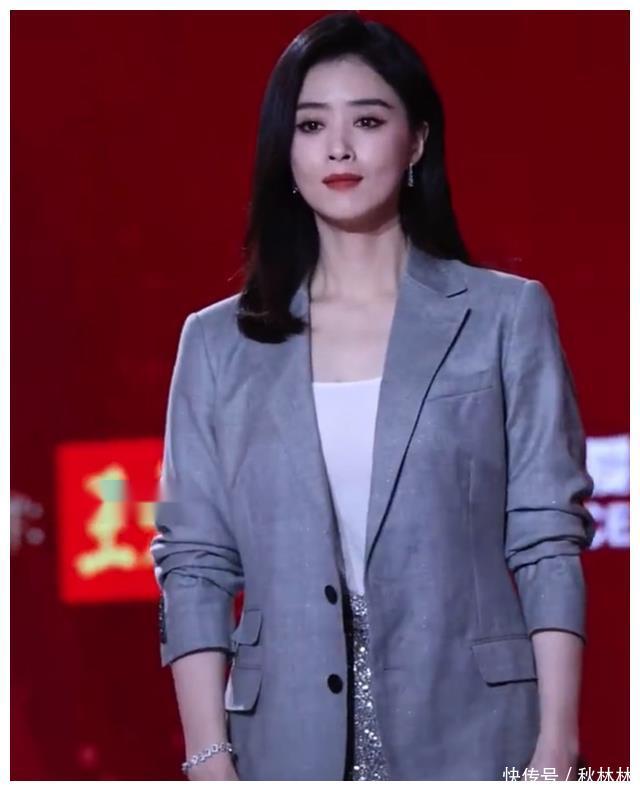 对于蒋欣这种大骨架的女人来说,穿西装是比较吃亏的,一不小心就容易穿出“熊腰虎背”的视觉效果来。所以在颜色的选择上,她选择了比较显瘦的浅灰色。