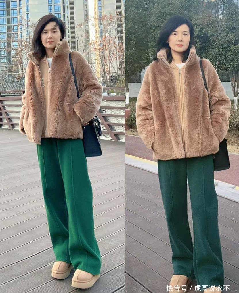 对于大衣材质的选择,中年女人可以直接区分为两种选择,而比起使用率较高的羊绒面料,很多女士也偏爱图中这样的羊羔绒面料。