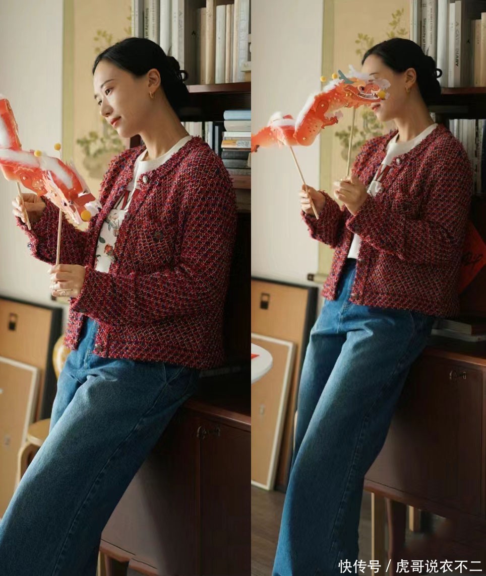 因此面对上图这件红色开衫,一定要懂得利用其他服装来进行协调,比如说牛仔阔腿裤的清爽休闲感,就能在一定程度上降低穿着压力,整体精致又不失帅气,很是耐看。