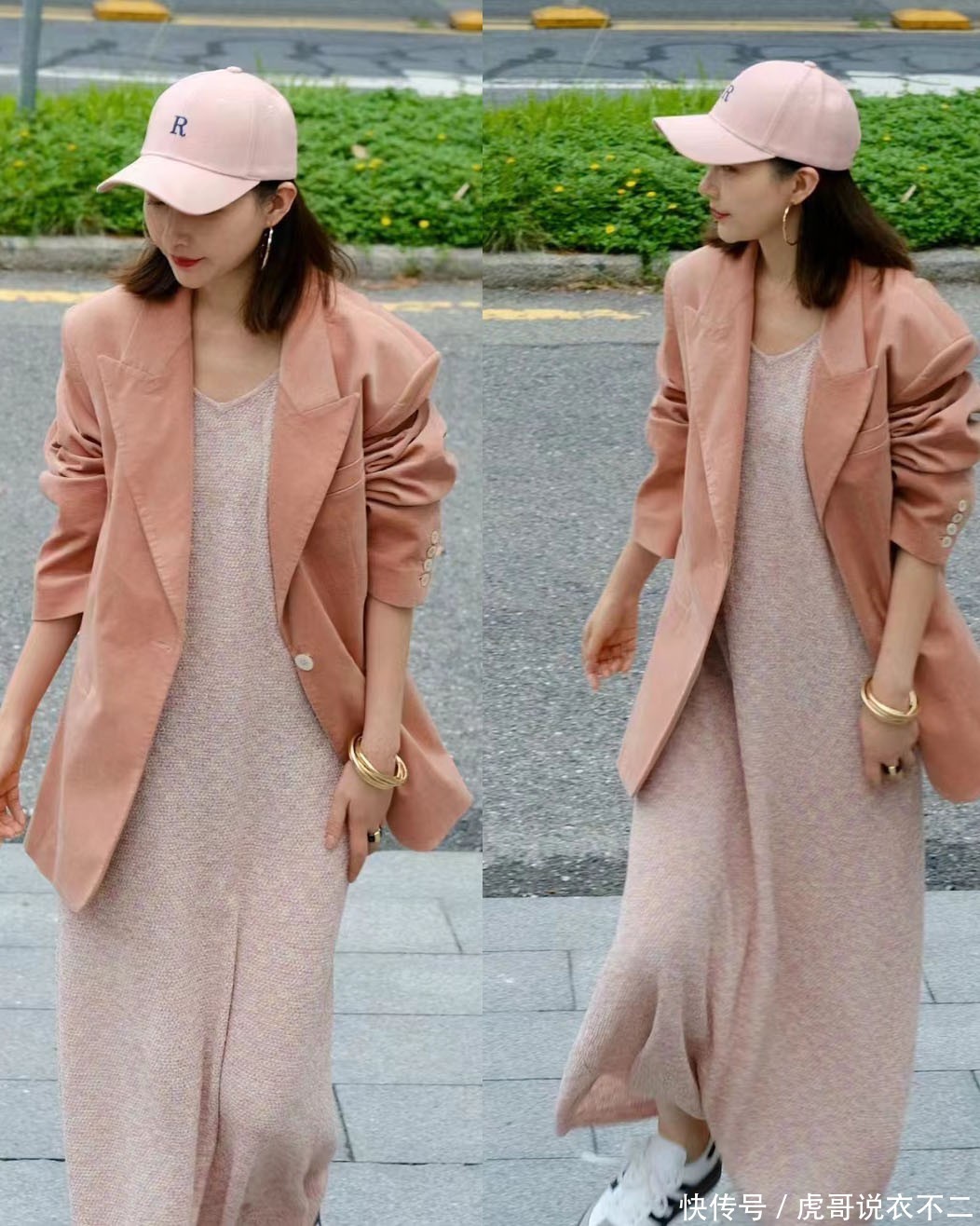 比方说上图这件杏粉色的小西装,就凭借着温柔的色调,赋予了外观几分活力的特质,完美的迎合了春季的氛围感,看起来相当优雅靓丽。