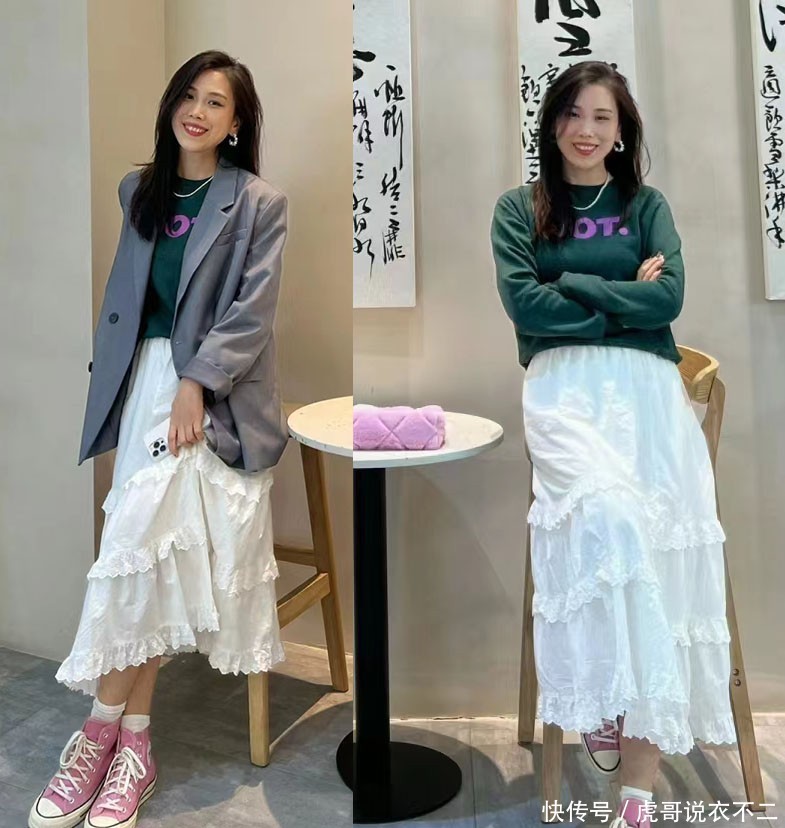 而小西装因为职场感过强的原因,与西裤配合着穿着的话,会显得有几分死板,不妨试试搭配半身裙,提高造型风格的层次感,显得人又美又飒。