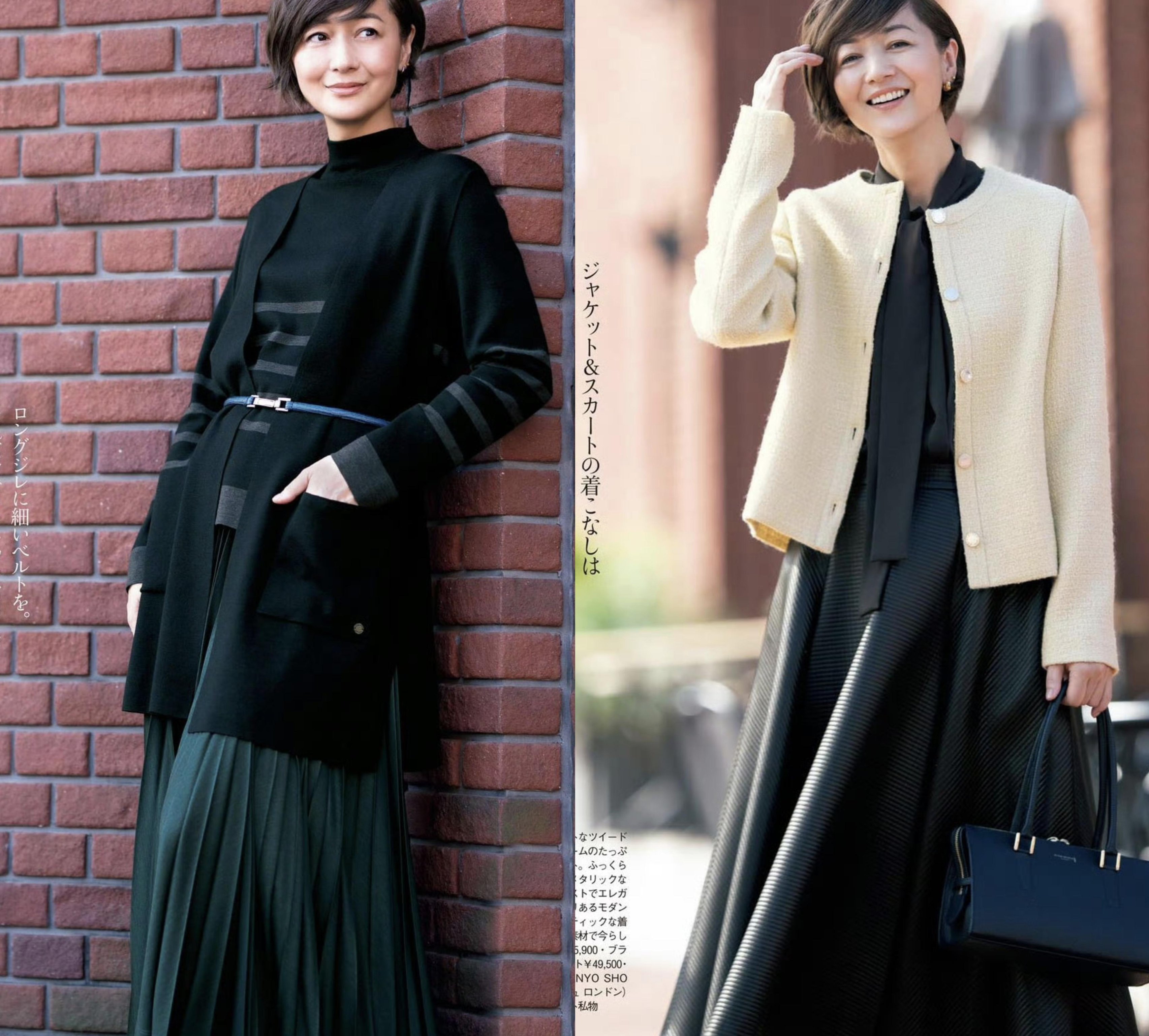 这两套穿搭都采取的是过膝半身裙和深色外套的结合,其实深色显瘦还是有一定的道理的。若是觉得太多深色叠加显得压抑,用大地色或浅色的裙装匹配就很合理了。