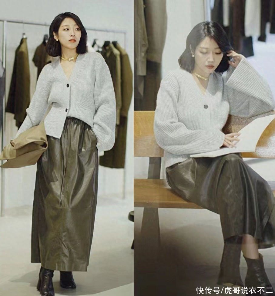 这件浅灰色的针织开衫,面料不仅厚实暖和,在视觉上也创造出了十分细腻柔软的感觉,而这种无法支撑起廓形感的面料,可以配合宽松设计,将气质展现出更慵懒松弛的意味。