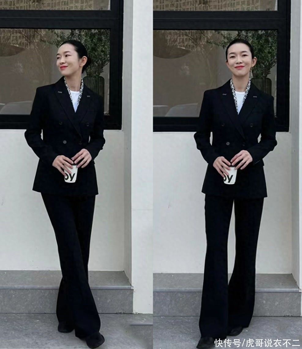 比方说上图这身西服套装,黑色小西装配合同色系宽松西裤,可以借助黑色极致的收缩感,将身段修饰出更瘦更修长的效果。
