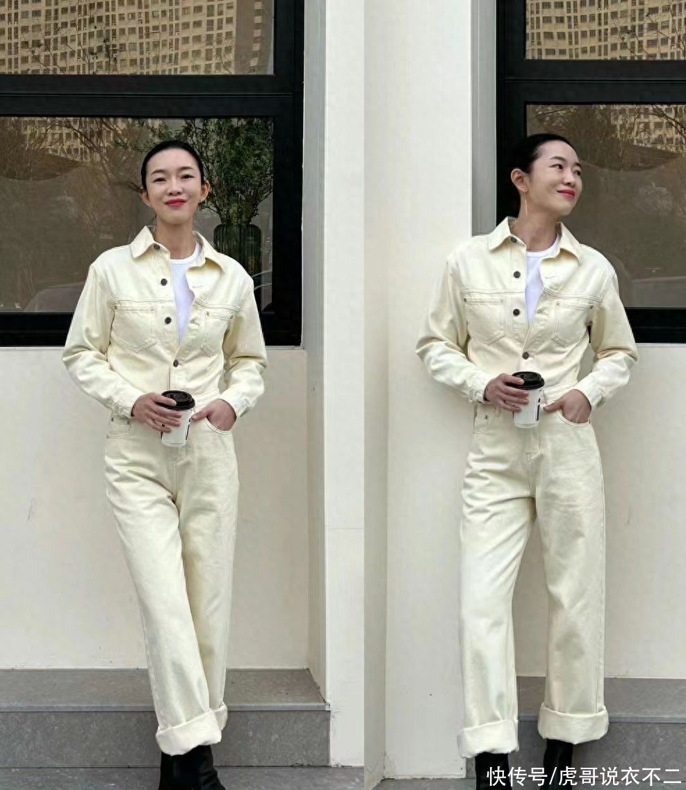 除了利用白色展现出轻盈感以外,其实白色也可以与直筒裤结合出很减龄的氛围感,比方说上图这件白色裤子,加长的设计可以拉伸腿部线条,再使用拉高腰线的技巧以后,那么外形也会呈现出格外高挑优雅的韵味。