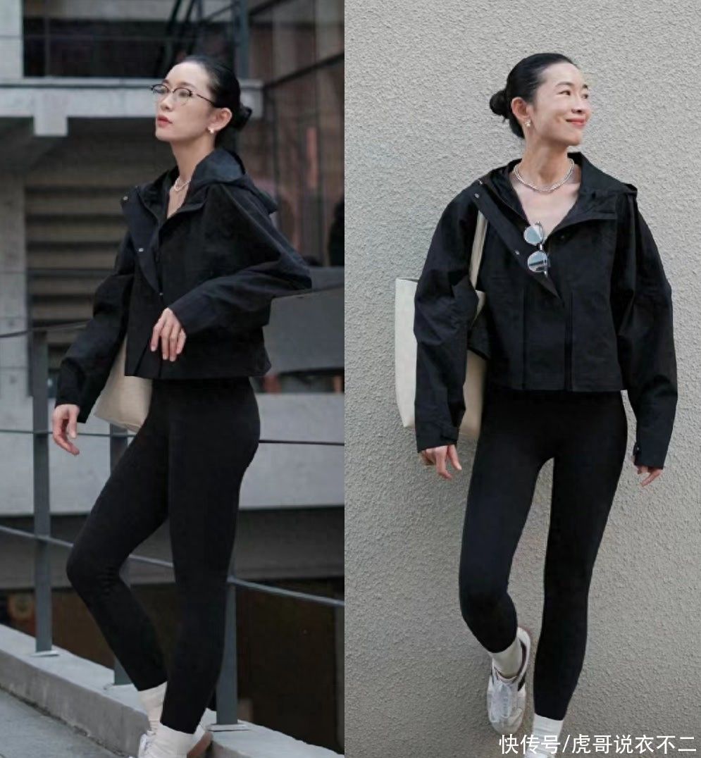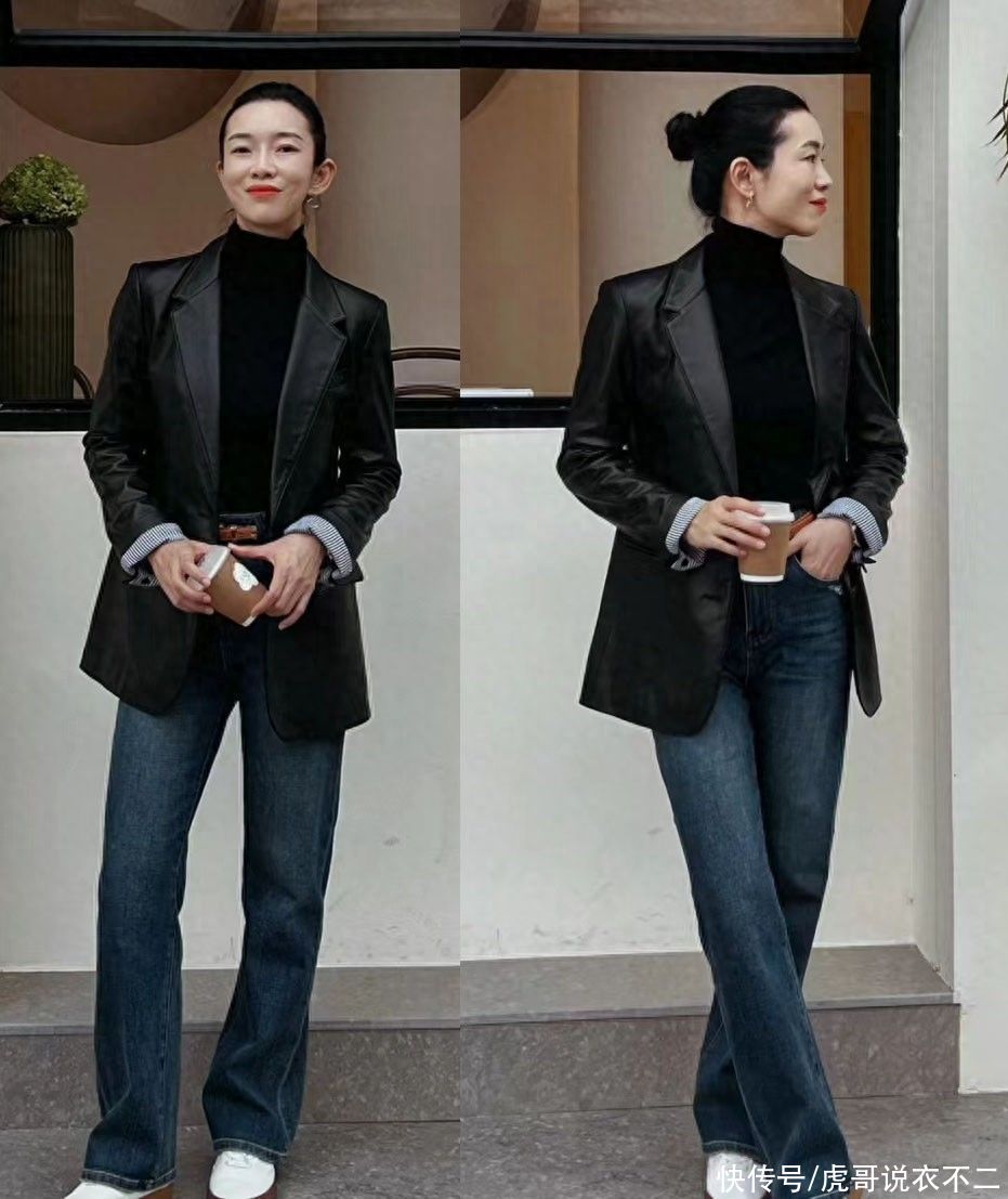 如果喜欢黑色短外套的话,那么版型的利落感,本来就能衬托出比较干练利索的身形,因此裤装的选择不一定要太紧身,可以适当加宽裤筒设计。