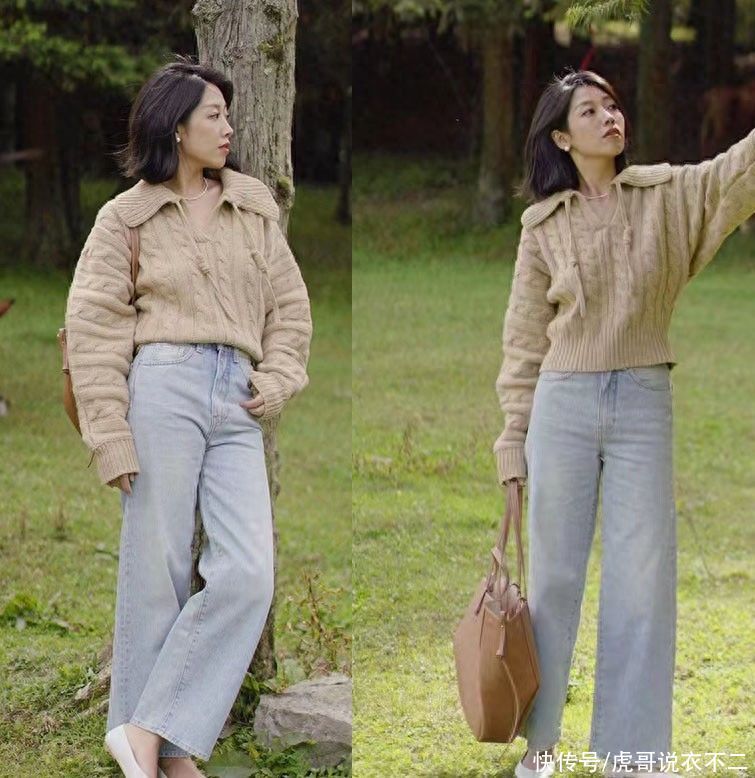针织上装的设计不单一,而图中这件浅驼色的针织POLO衫,在表面还有着扭花设计,可以在温柔的氛围感中,诠释出几分减龄的趣味,而下搭浅蓝色牛仔裤,也可以叠加这类风格,使中年女士的外形更为年轻时尚。