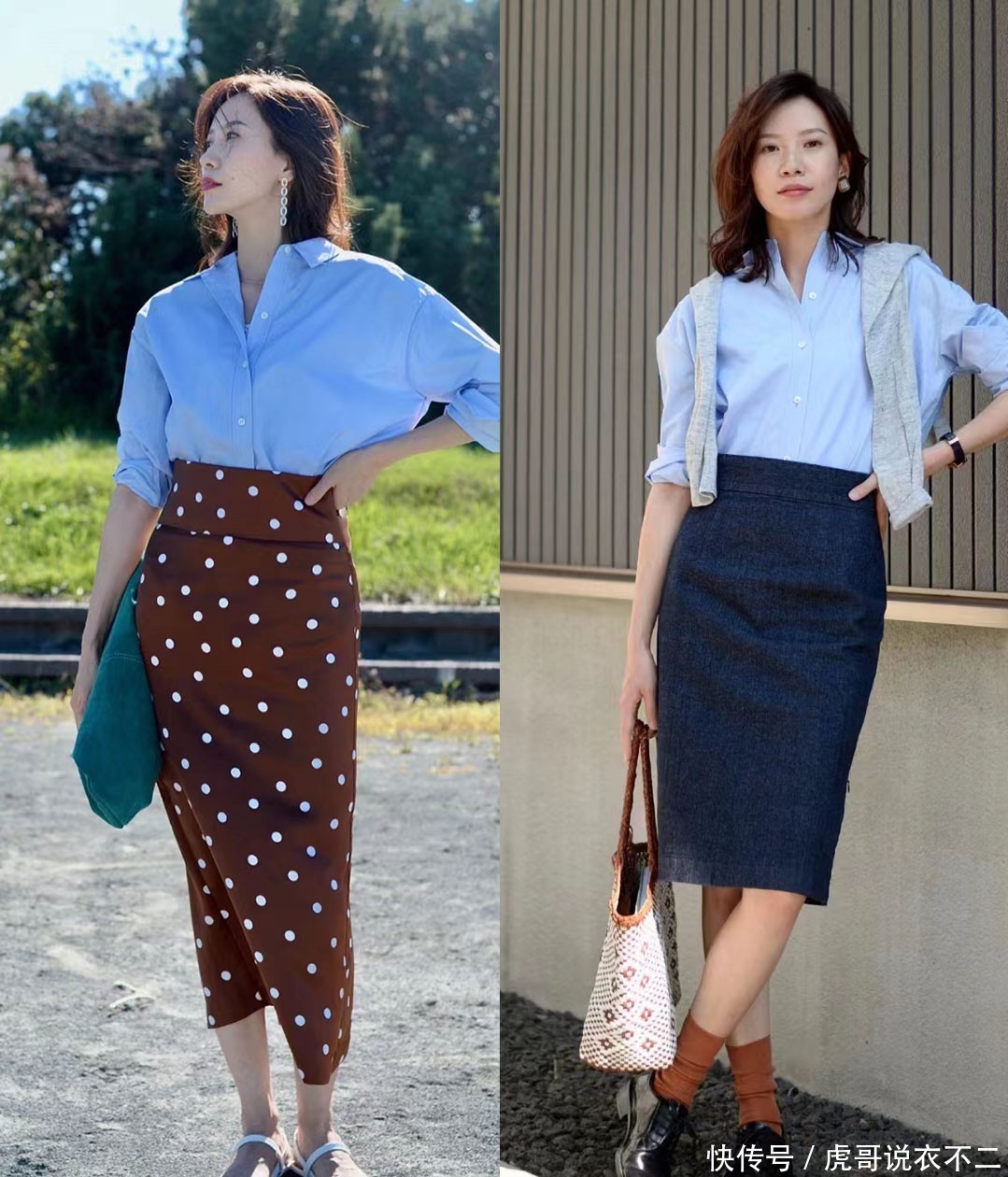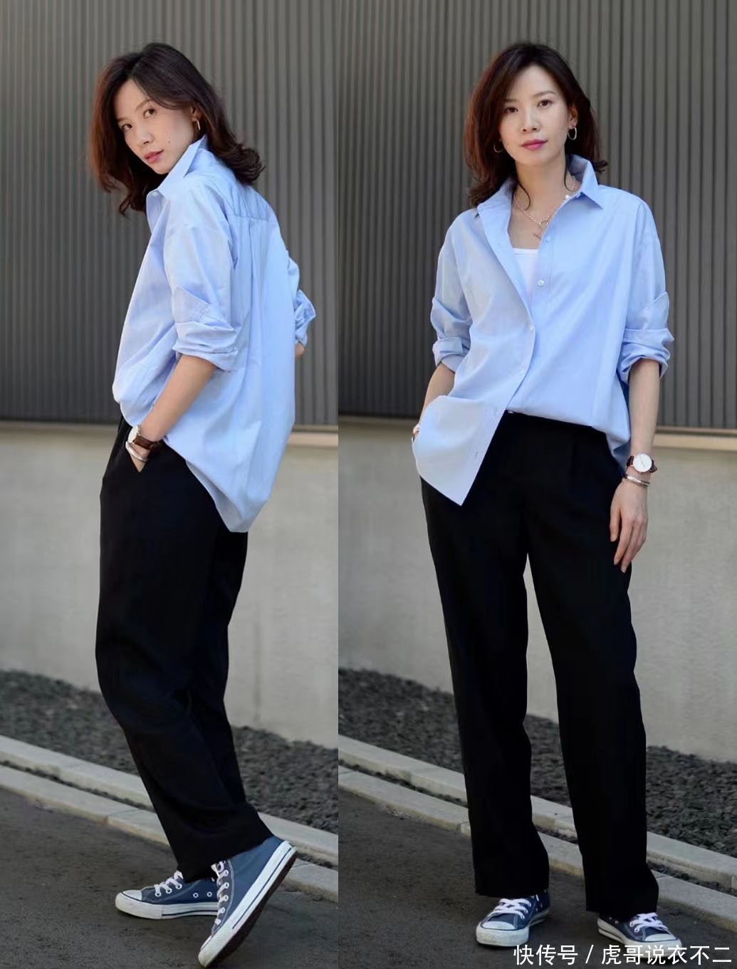 秋季的气氛略有些许的低沉,与黑色携带的风格比较相似,这也是在这一段时节特别受欢迎的原因。但相信不少女性也会发现色调对于面容状态的影响力,因此选择搭配浅蓝色的衬衫,就可以使整体协调感得到加持。