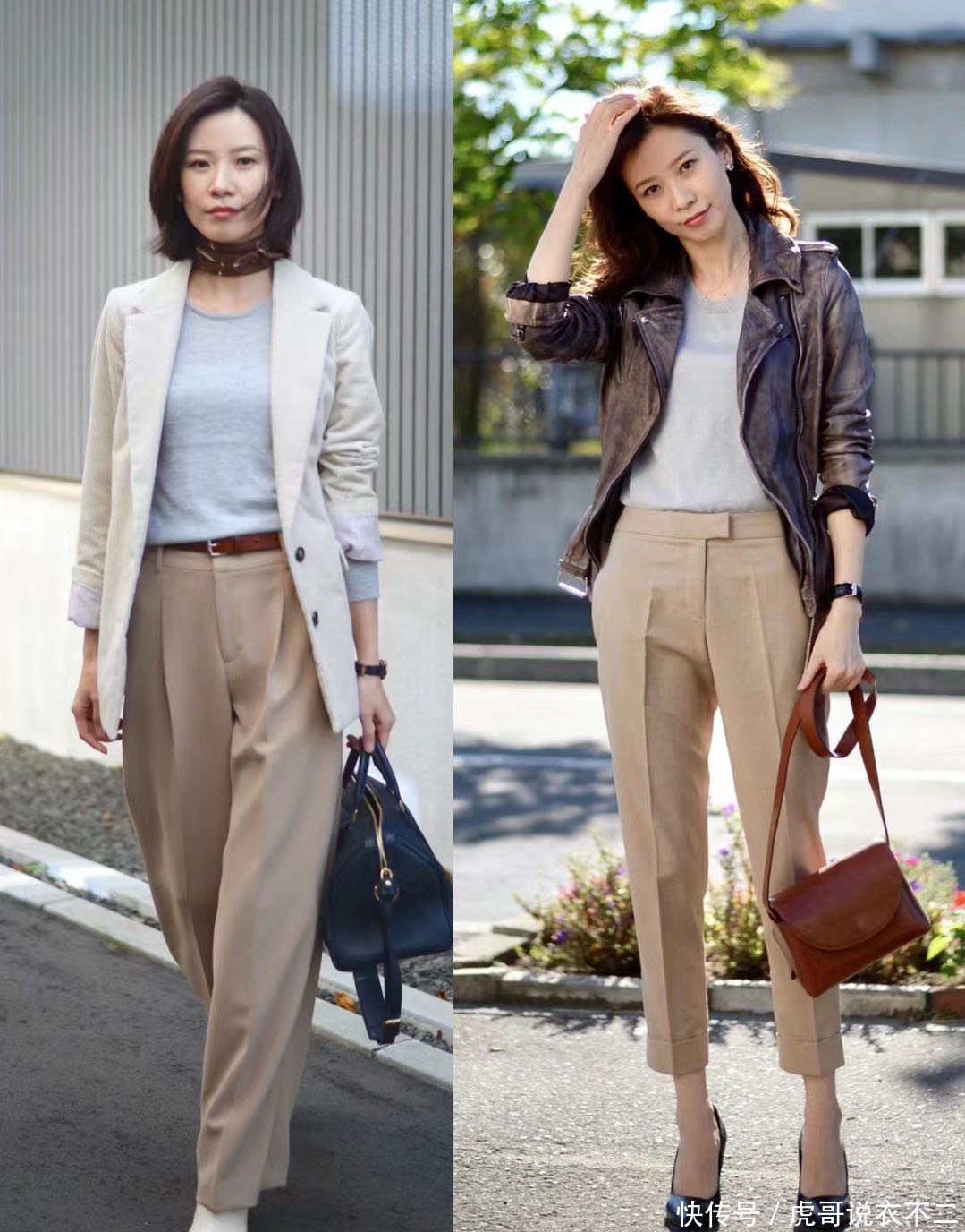 像图中这位博主选择的两款不同长裤中,就都使用了大地色,轻松彰显出了成熟稳重的气势,注重一下腰线位置,更显高更瘦。