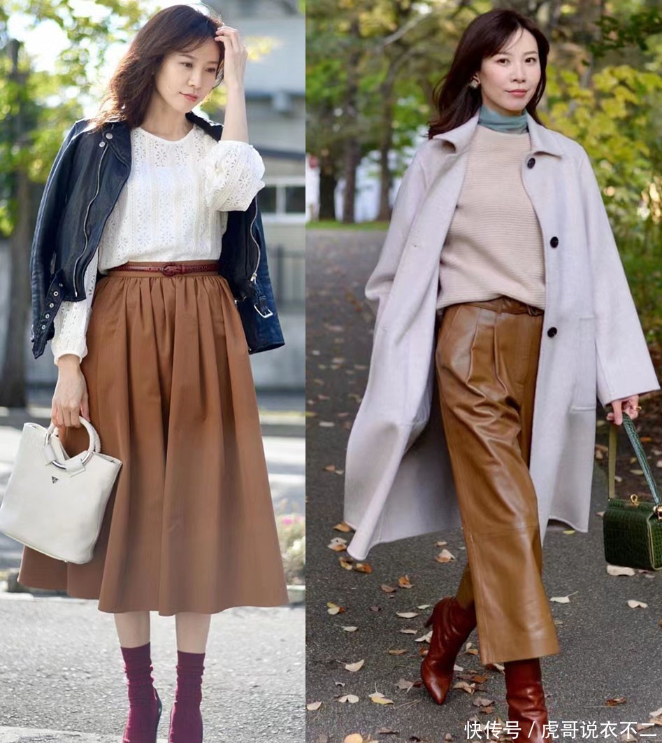 大地色是某一类色调的统称,根据饱和度的差异性,在视觉上并不会演绎出太雷同的风格。若是将饱和度调高以后,那么色调看起来就会更浓郁复古。而右图这一件阔腿裤还利用了皮革材质,更适合打造出摩登造型感。