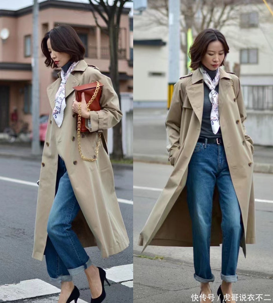 比如说这件浅卡其色的长风衣,在搭配时可以尽量追求协调感,毕竟长衣摆加宽松版型,本身就创造出了太多的拖沓感,因此利用修身牛仔裤匹配,那么就能避免拉宽体型,依旧可以让人穿出高挑比例与率性风采。