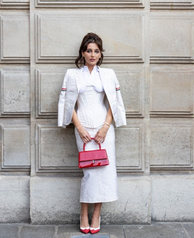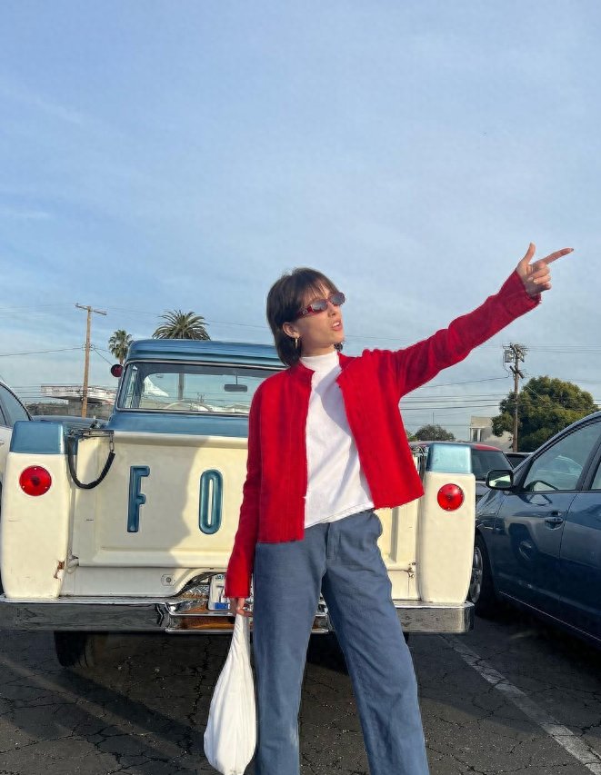 红色针织衫与牛仔裤,上下虽然都呈现纯色,但却营造出了浓郁的vantage风美感,优雅又高级,。