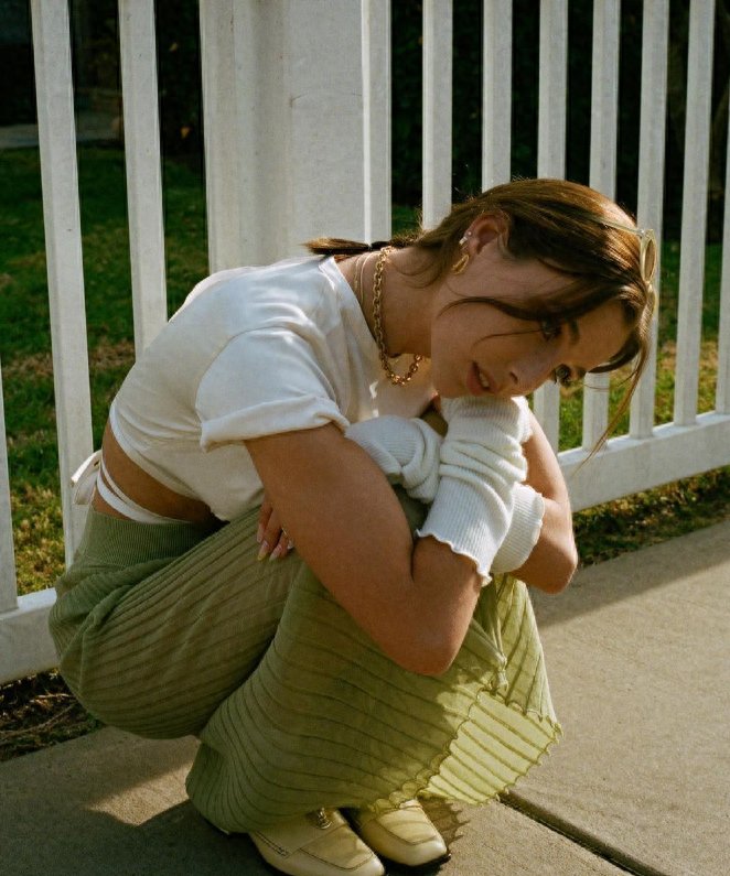 她身穿一件白色针织衫,下身则是卡其色百褶裙。整个造型简约、清新而不失时尚感。