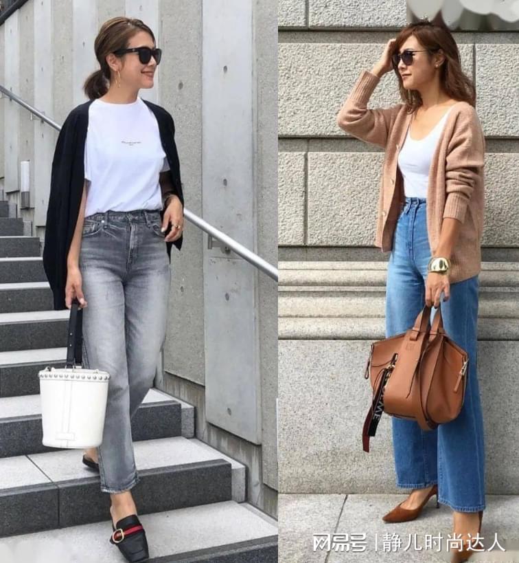 而针织衫也很适合用来叠穿,柔软的针织衫叠穿白T恤,配上牛仔裤,搭配风格温柔极了,同时又很显腿长,甚至你还可以在脚下配上一双浅口的高跟鞋,更好地拉长你的身材比例,整个造型简单却很显身材。