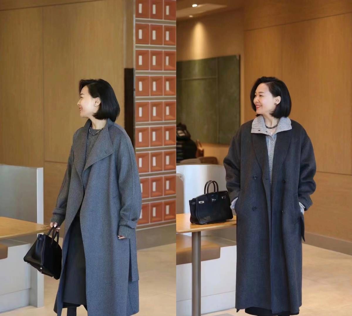 一件灰色的长款大衣,展现出来的包容性也是很充足的,在里面可以搭配带有领口衔接的针织衫,而解锁出层次的感觉。