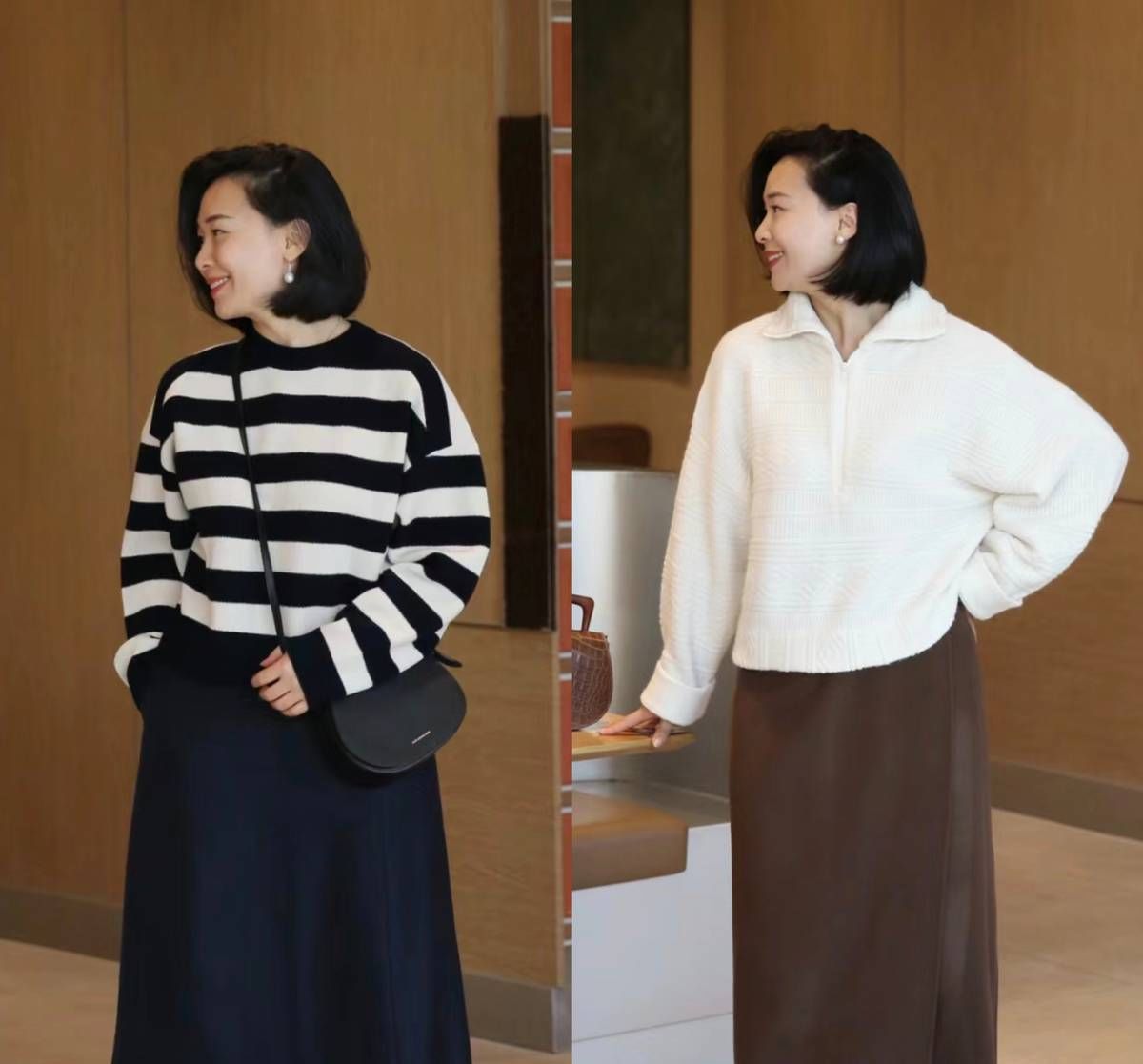 例如这两条过膝半身裙,大家如果想要更有特色,挑选皮面的设计,会稍微的合适一些,搭配纯白色的毛衣,清新又有气质。
