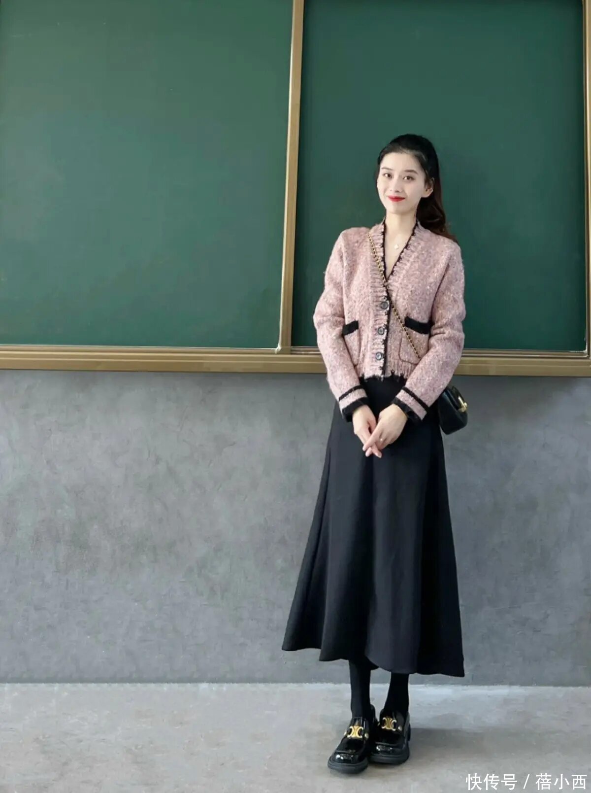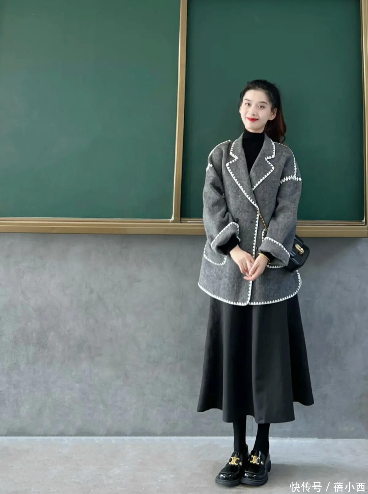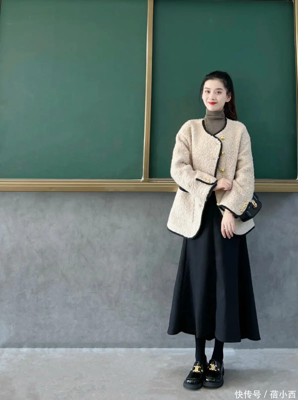 作为教师,若是要穿裙则应当以过膝长裙为主,更显优雅,而且像这样的黑色半身长裙简约大气,经典永不过时,搭配着白色的羊羔毛外套,也凸显了温柔优雅的气质。