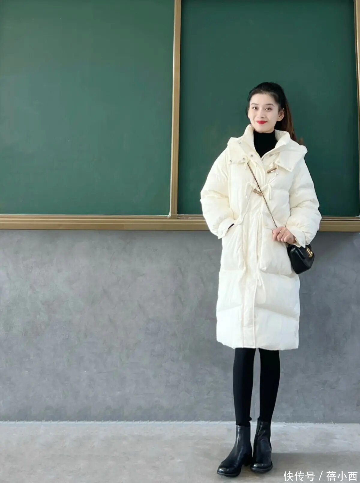 白色的羽绒服穿上身,包裹了我们的全身,舒适简单,轻盈的羽绒服也完全不会觉得厚重,更不需要担心穿在身上会显得臃肿。下半身的黑色打底裤搭配起来配上了黑色短靴,也让视觉上显得更高更瘦。