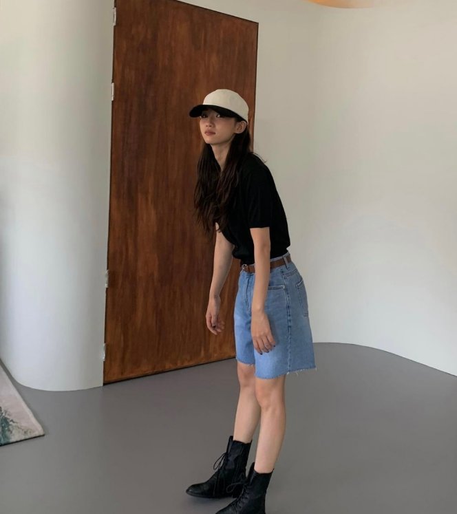 黑色的针织衫穿在身上特别的显瘦,不仅有很好的气质,还有减龄的效果,一条五分牛仔短裤,显高挑的时尚效果。