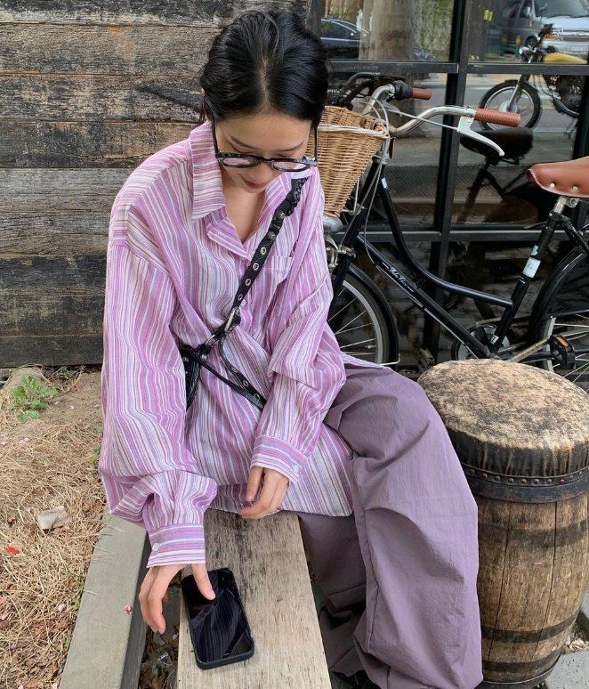一款紫色条纹衬衫搭配同色系的长裤,温柔十足,看着好嫩好优雅,完全就是小姐姐的模样