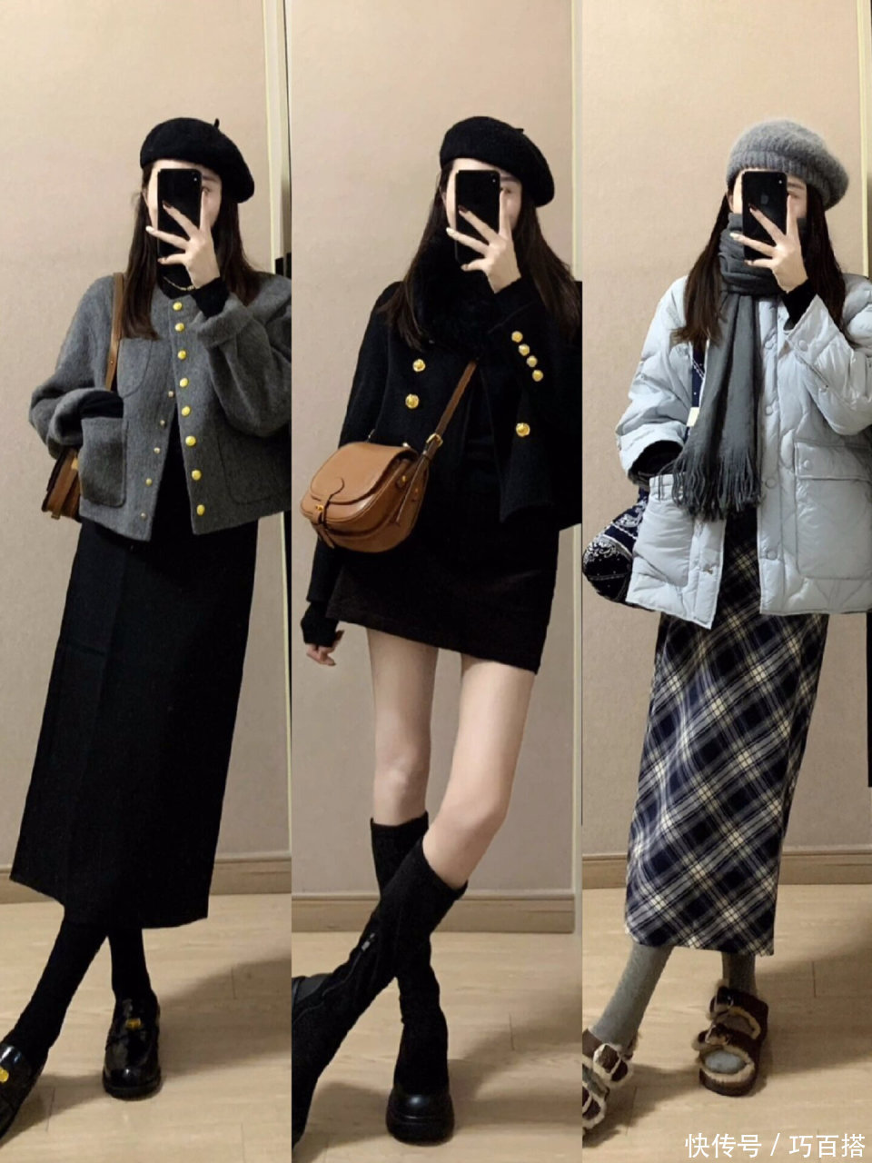 除此之外,博主30套保暖穿搭中也出现了很多次半身裙,加绒打底裤或者黑丝加绒打底裤与之搭配,没有任何瑕疵。