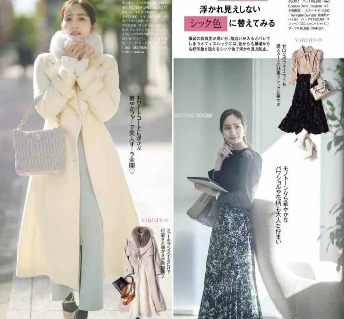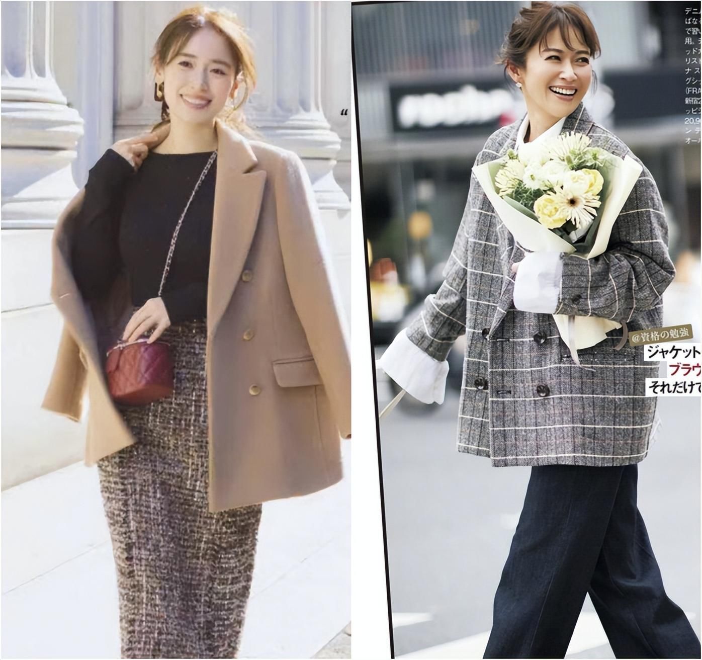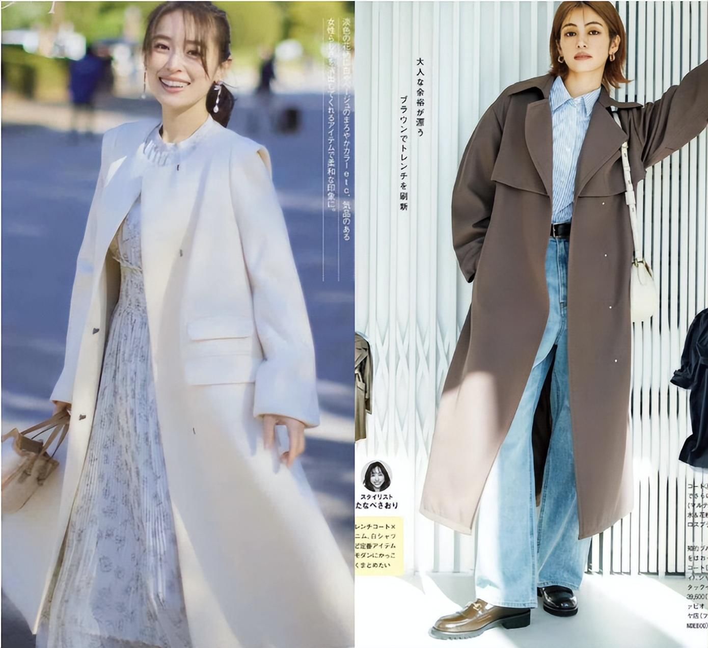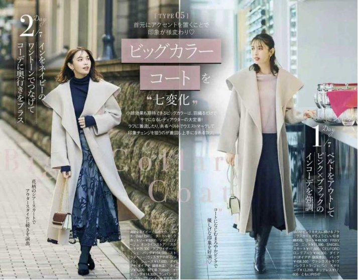 这两件大衣都是翻领的设计,让服装的层次感得以一个简单的烘托,在下半身可以加入不同种类的裙子,但都要过膝,才更显瘦。