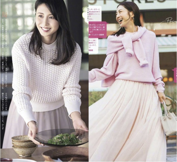 像这两件粉色的毛衣单品,它们的颜色都十分的浅淡,可以衬托出女性温婉的一面,在下半身也可以叠加同样是浅色的裙装,微风吹拂,裙装摆动,氛围感十足。