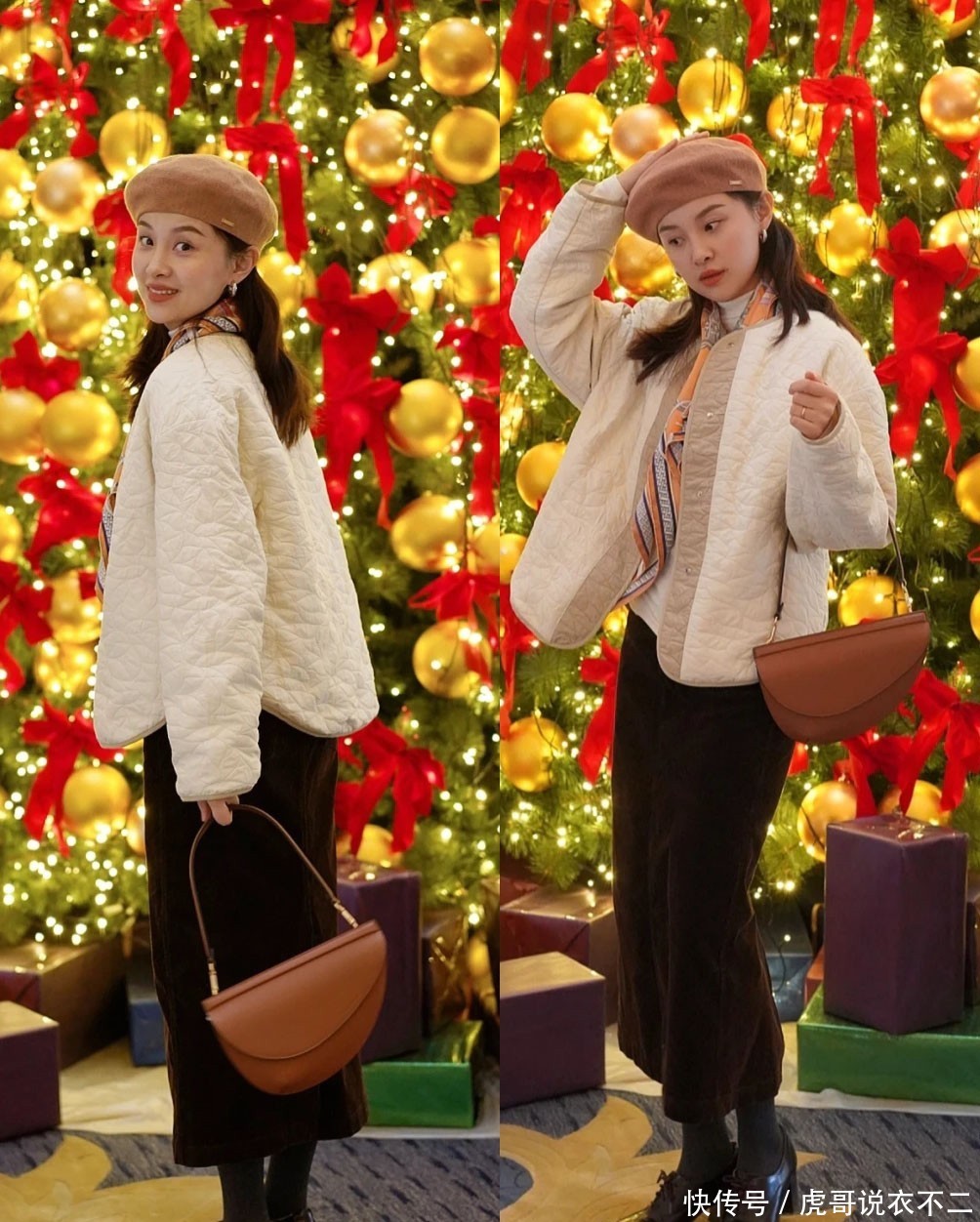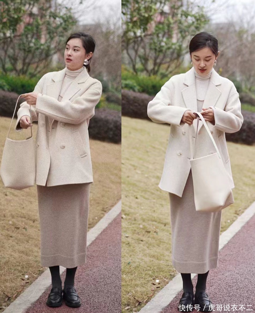 这时在冬季塑造穿搭时,不妨在衣柜中多准备好一些色调简约的服装,比方说上图这身穿搭中,白色大衣就与浅褐色半身裙,形成了一组优雅端庄的look。