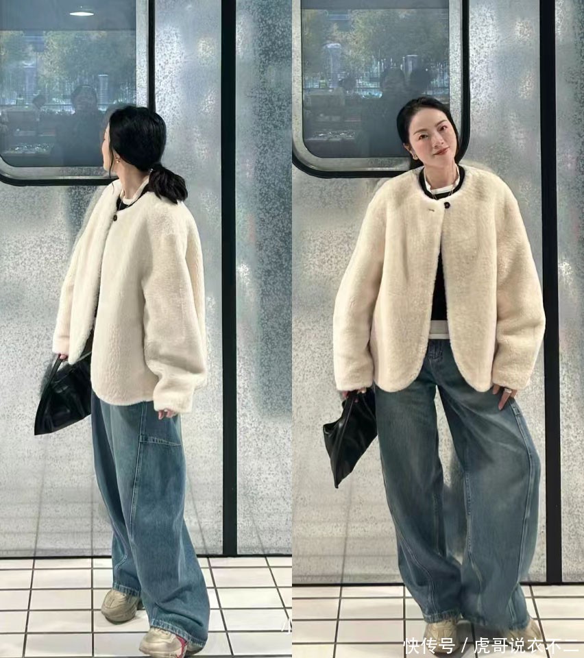 这件羊羔绒外套也可以借鉴上述的技巧,运用短款设计,增添外观的利落性,并凭借无形之中构造腰线的优点,保持住上半身的重心。这样下装即使选用很宽松的阔腿裤,也难以创造出邋里邋遢的既视感。