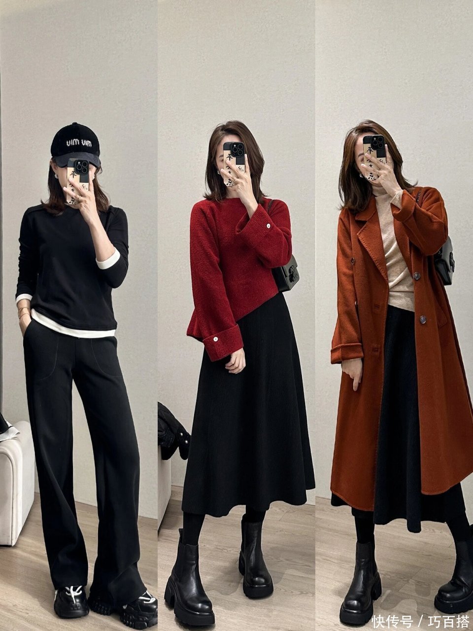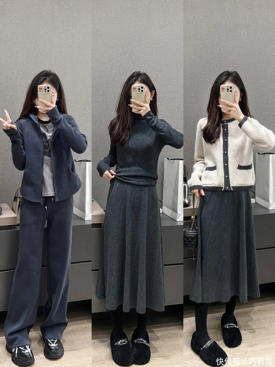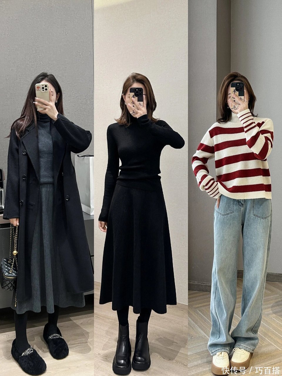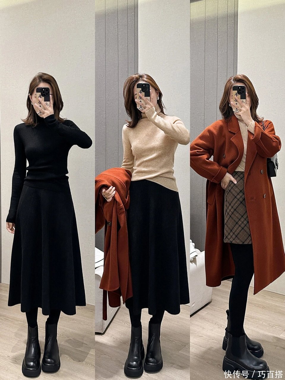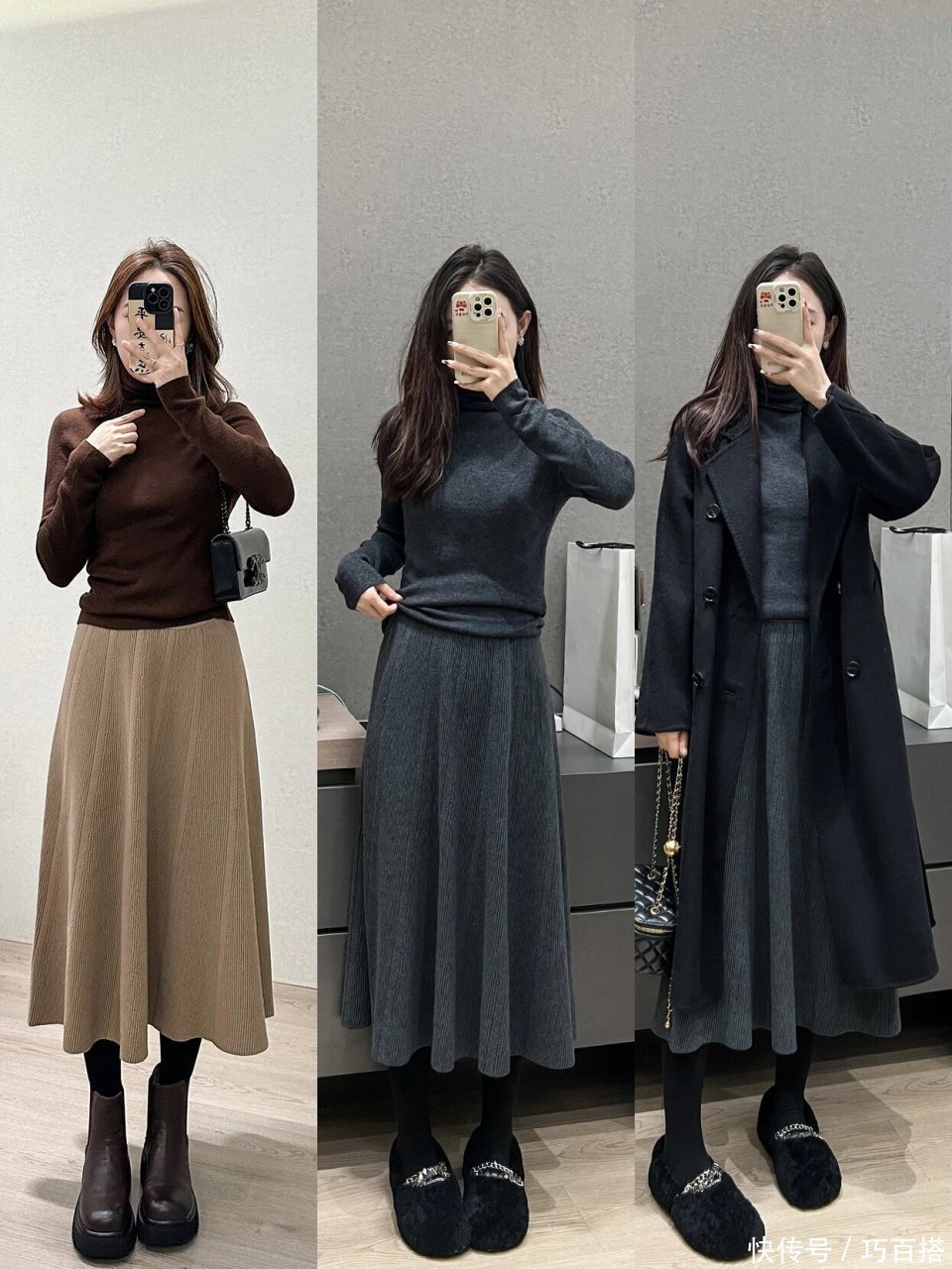 对于更年轻的女孩来说,高领紧身打底衫+直筒不过膝短裙是最佳组合方式,如果你有年龄或者氛围感上的优势,直接选用卫衣+高腰百褶短裙的组合方式,效果也是很好的。