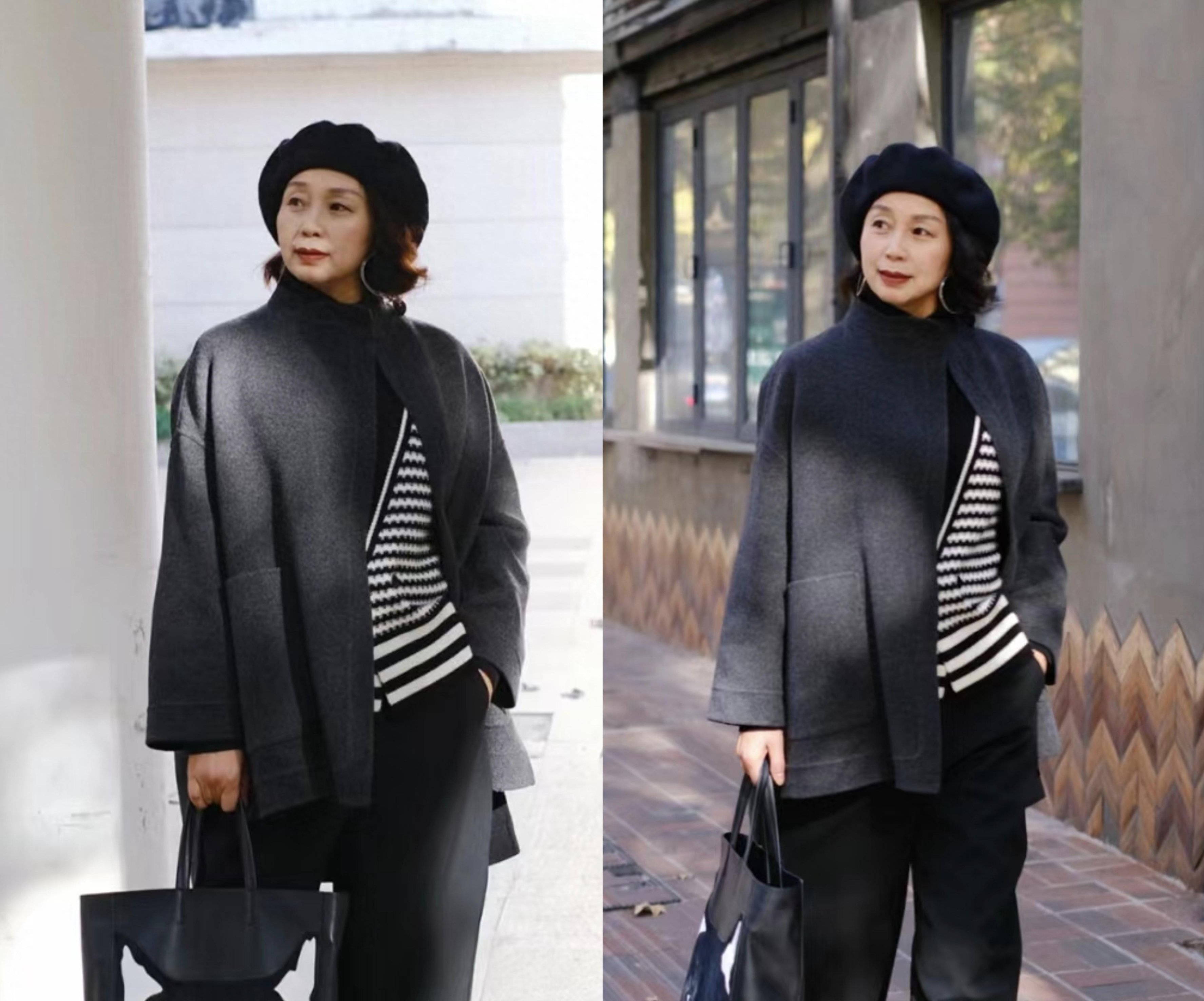 比如这件深灰色的大衣,它的整个样式不会特别新潮,但对大龄女性十分的友好,对肤色没有过高的要求。