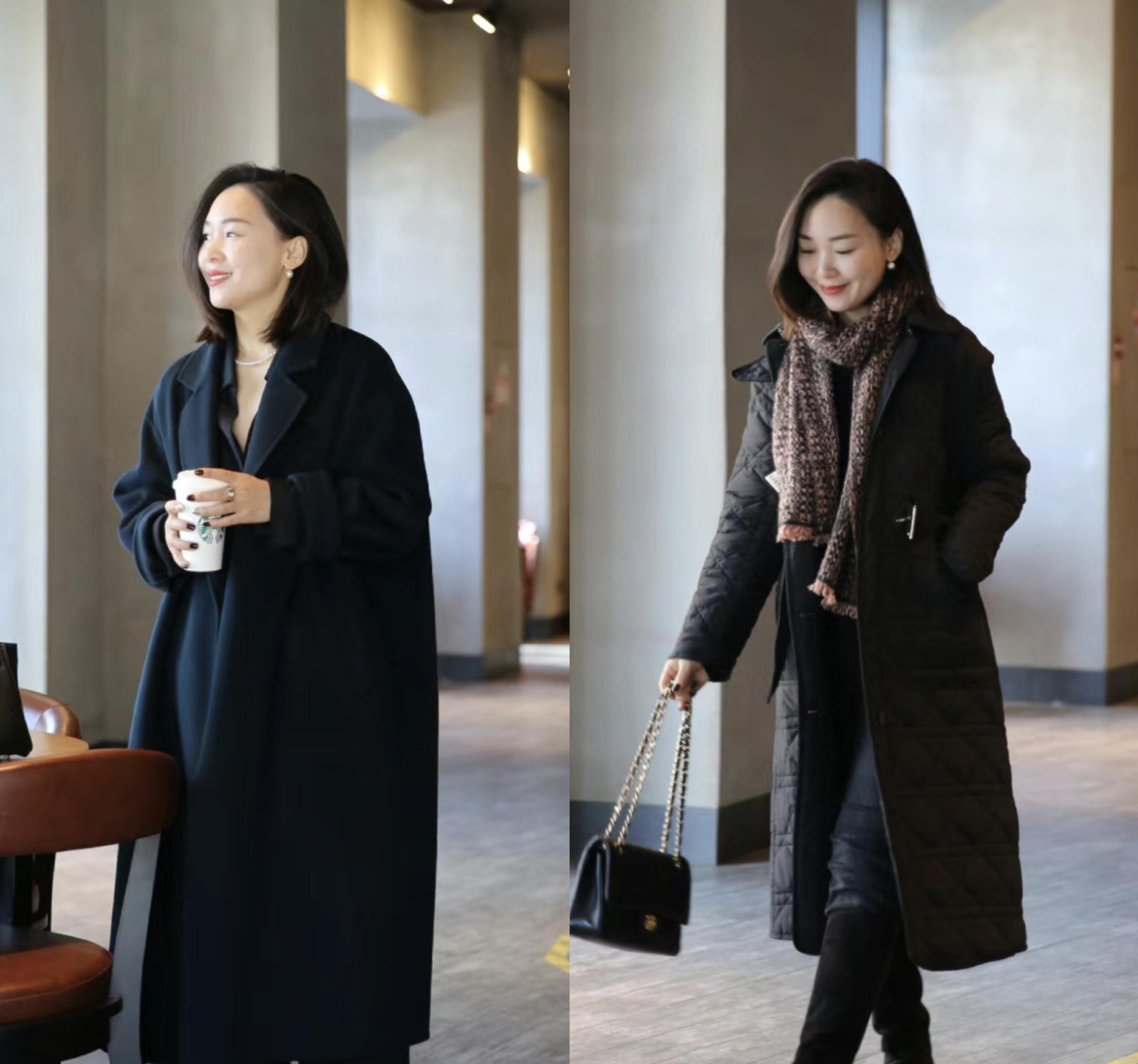 这两套穿搭,选取的大衣色彩各有不同,但整个大衣的款式设计是相似的,黑色会让女性气场全开,深棕色则拥有大地色固有的治愈氛围,让整个画面的基调稍微的生动一点。