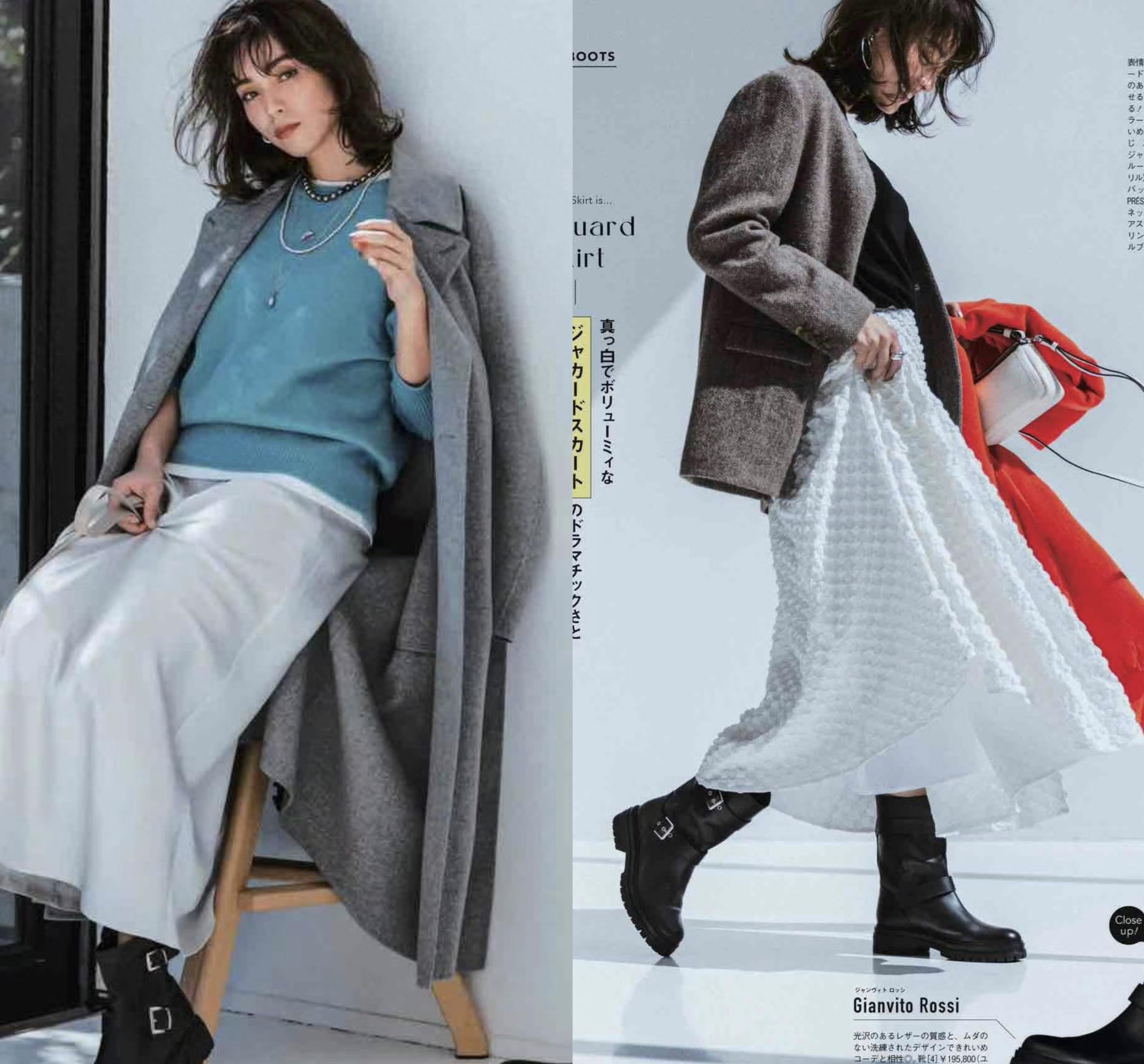 比如这两件长款大衣,它们都结合了过膝类型的半身裙,就能够把大腿的位置很好的覆盖住,而增加一些些显瘦的效果。担心露脚踝不保暖,也可以在里面叠穿深色的打底裤。