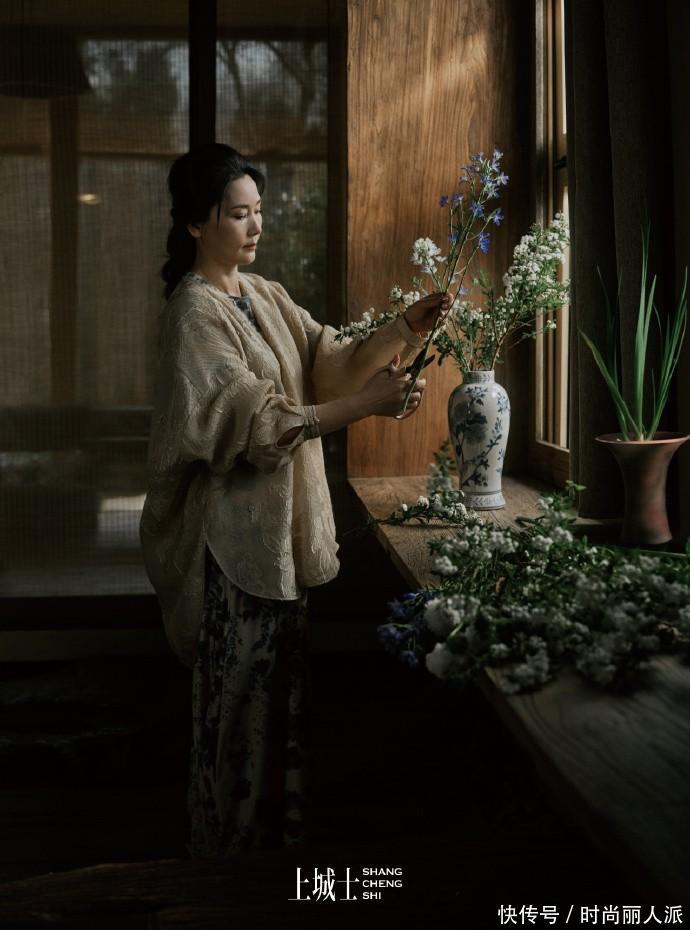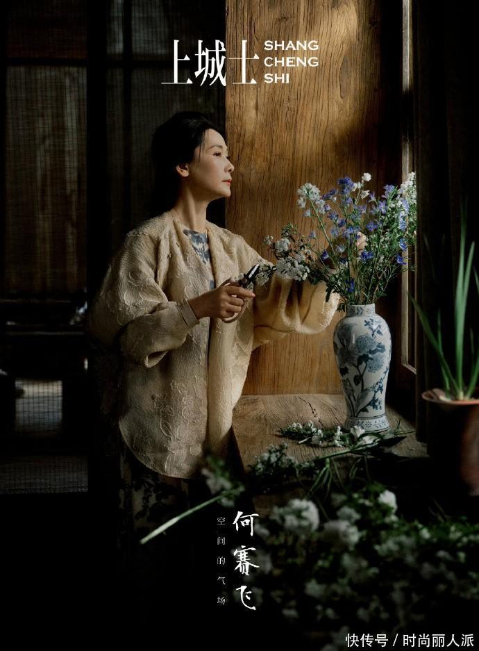 何赛飞的整体风格都是偏日常化的,有种岁月的沉淀感。插花时的何赛飞身穿一件提花外套,低调的卡其色与立体的提花元素相搭,将这件外套衬托得格外重工。宽大的衣袖遮住何赛飞的手臂,手腕处的褶皱痕迹增添外套的层次感,哪怕是一件比较普通的外套,也被何赛飞穿出了高级感。